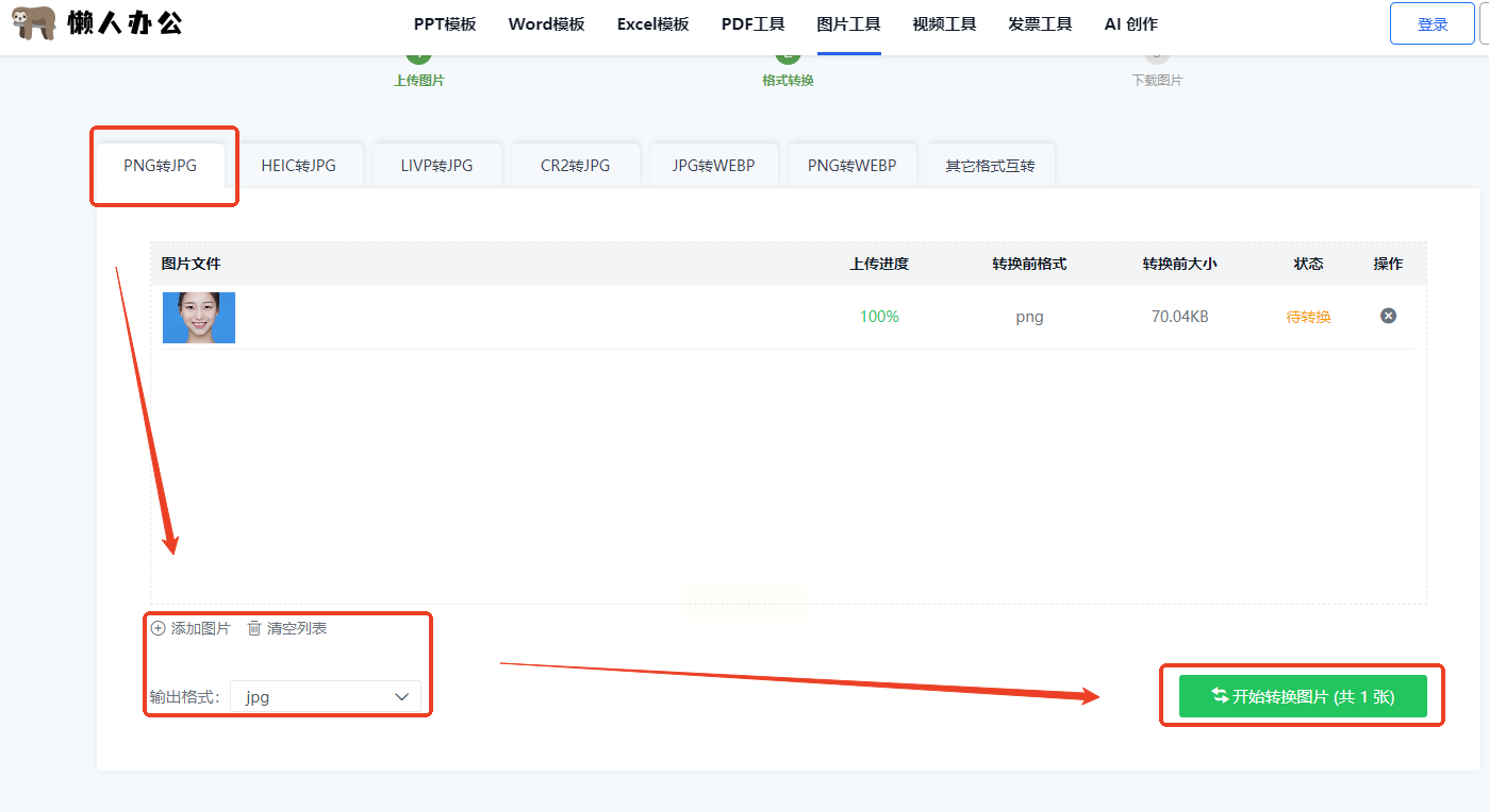 进入网站后,找到【图片工具】里的【图片格式转换】,然后选择“PNG转JPG”。上传你的图片,设置输出格式为JPG,点击【开始转换图片】。如果需要,可能会提示你扫码登录,但一般不用。转换成功后,直接下载就行。
