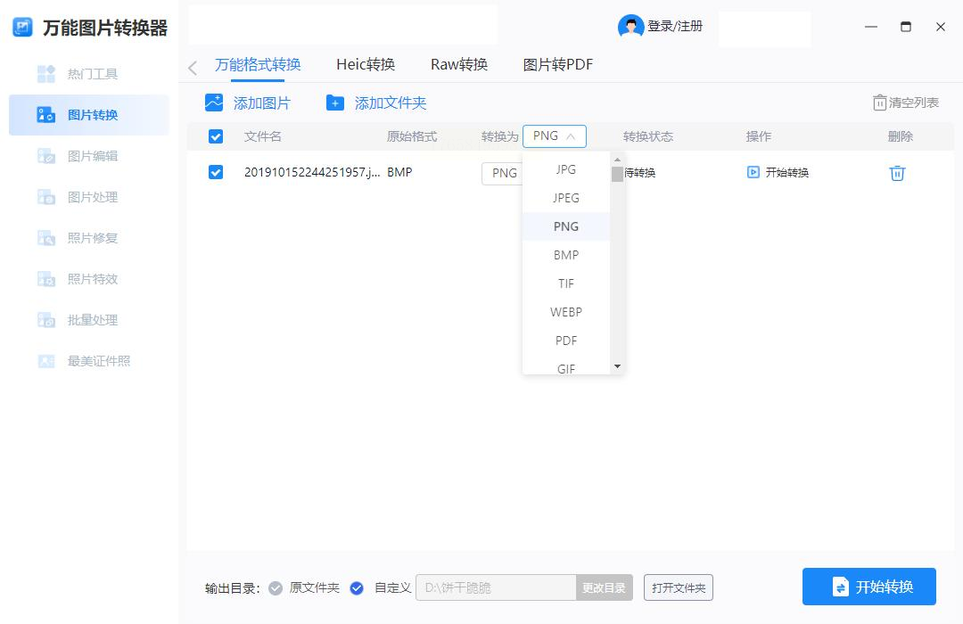 拖完图片后,在右边有个“转换为”的下拉框,选“PNG”就行。然后在“输出目录”那里点“浏览”,选个你方便找的文件夹,比如“桌面-转换后的图片”,这样转换完直接去桌面就能看到。