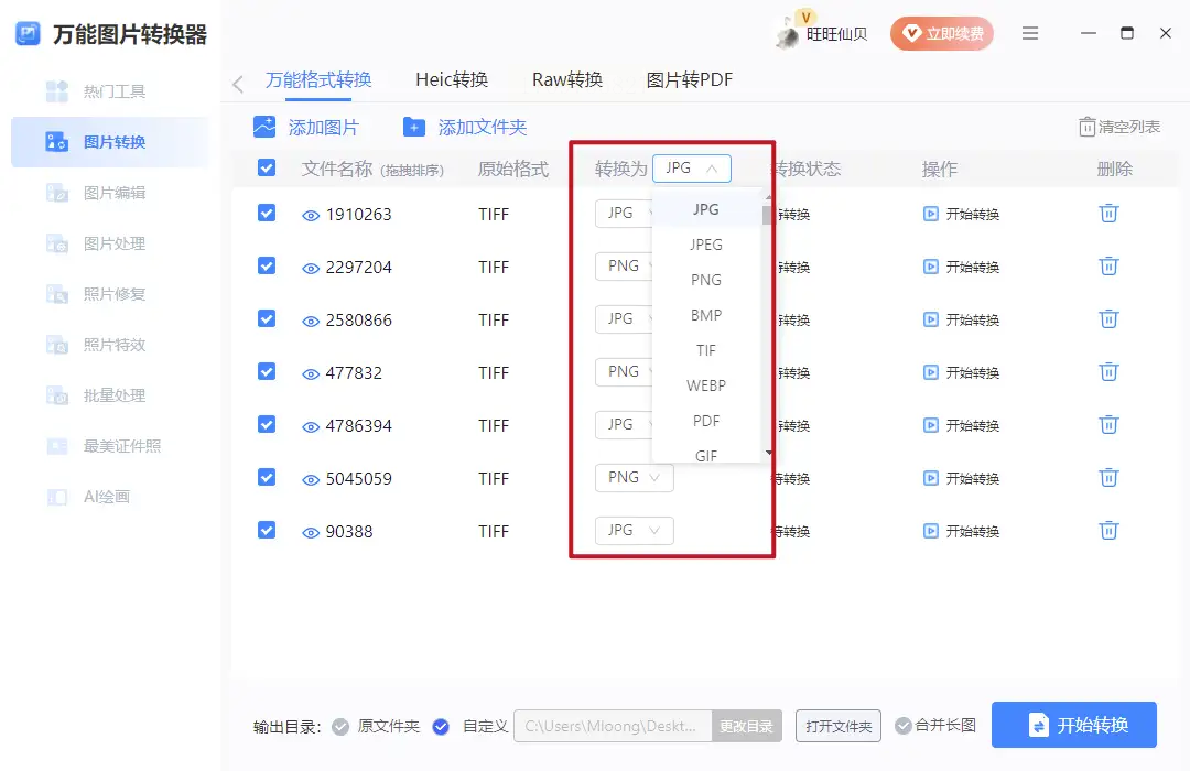 2. 批量转换时勾选"全选",单张图片可单独设置参数