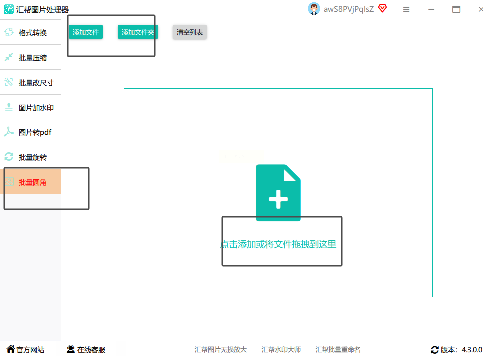 - 点击左侧菜单「批量处理」→「图片圆角」