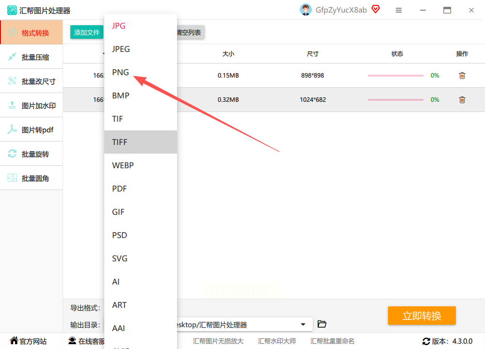 2. 在格式选项中选择“PNG”,系统会自动开始转换。