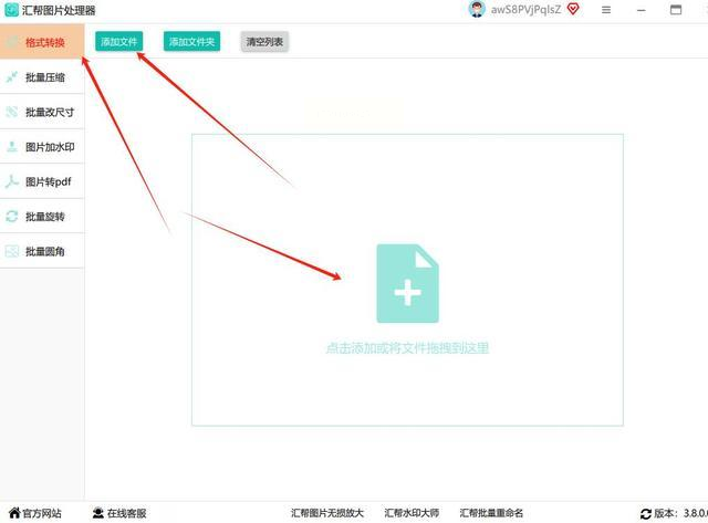 2. 添加图片:打开软件后,在界面左边找到「格式转换」这个选项,点进去。然后你可以用两种方式添加图片:要么点左上角的「添加文件」按钮,一个个选择要转换的JPG;要么更简单,直接用鼠标把图片从文件夹里拖到软件界面上,支持批量添加,一次拖10张都没问题!