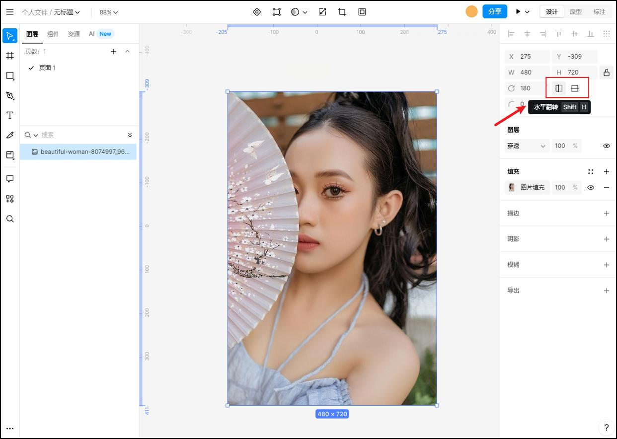 3. 在右侧属性面板找到变换控件,点击镜像图标实现批量翻转。