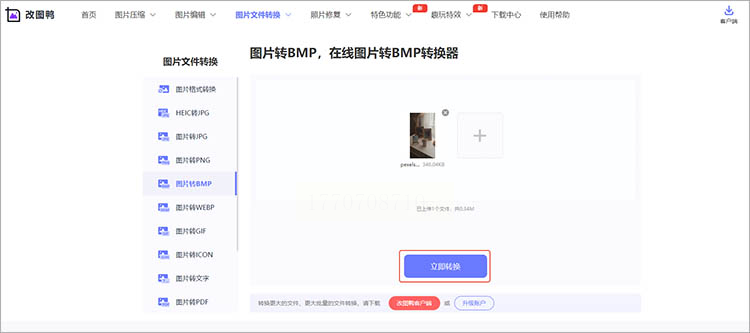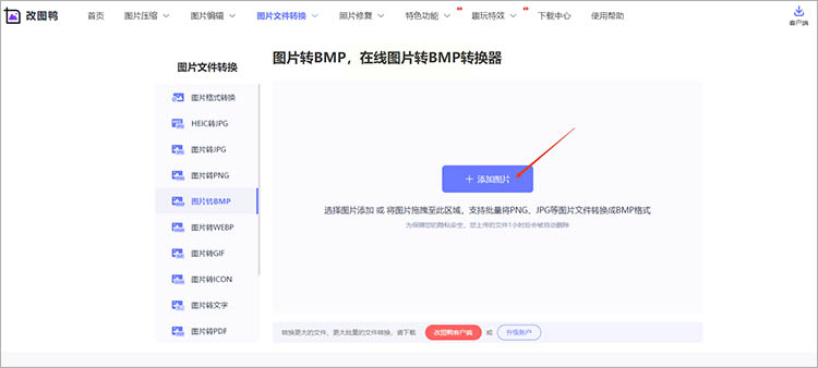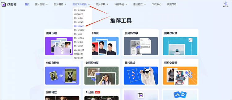 打开浏览器进入改图鸭官网,在功能导航区选择"图片转BMP"服务。无需注册账号,直接进入转换界面。