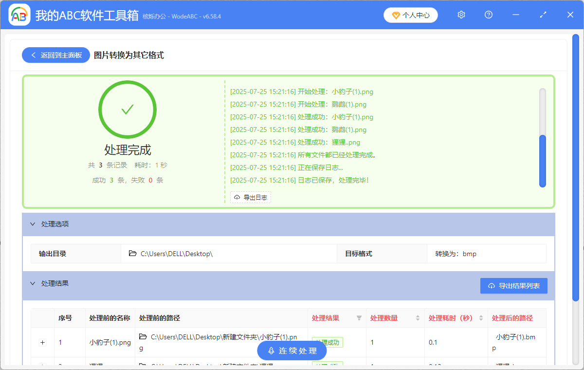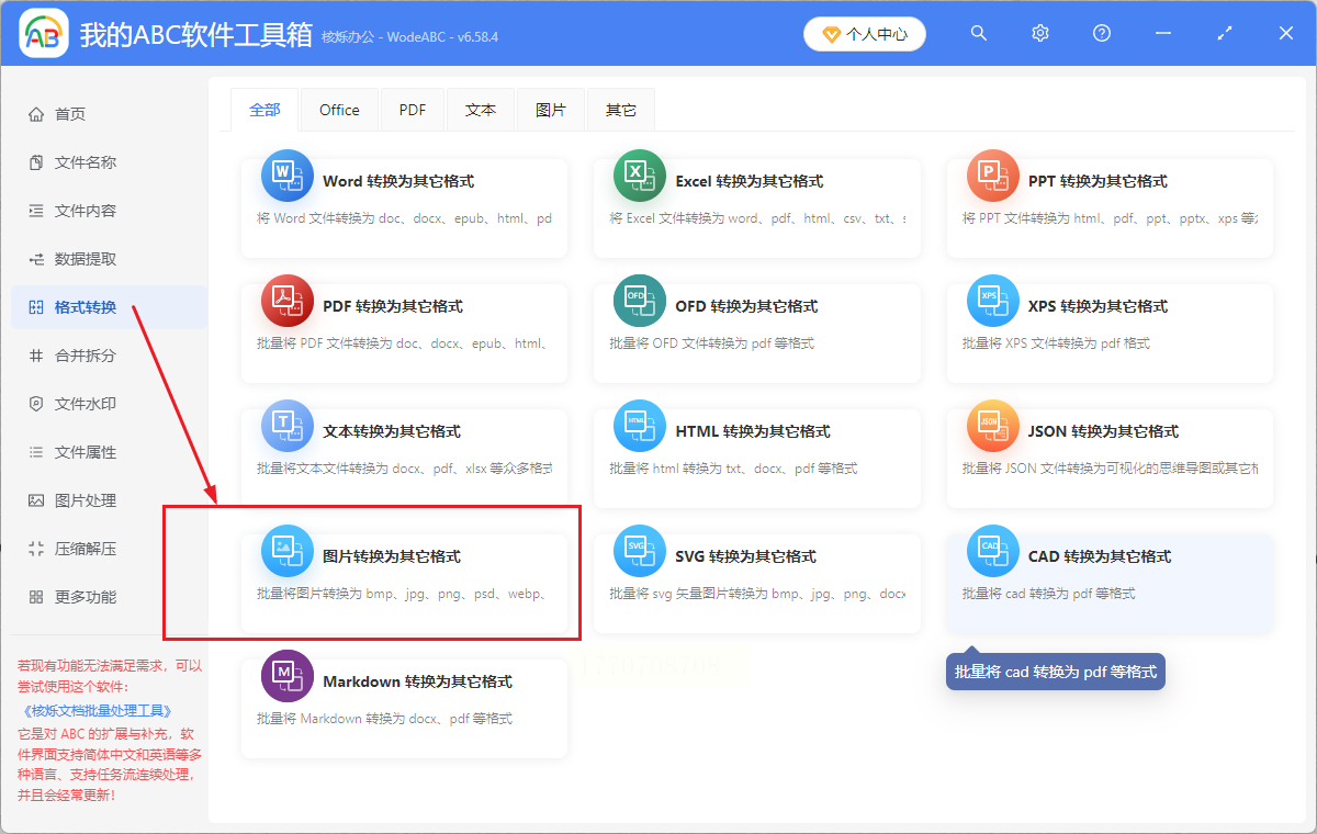 对于仅需简单转换需求的用户,我的ABC软件工具箱提供"一键转换"式体验,适合日常办公中的快速格式处理。其界面简洁,三步即可完成单张图片转换。