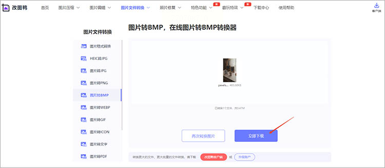 转换完成后,点击"下载"按钮将BMP文件保存至本地。支持直接预览转换效果,若需重新转换可点击"重新上传"修改参数。