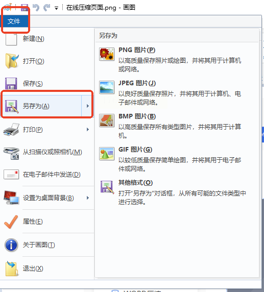 步骤二:图片在画图中打开后,点击左上角的“文件”按钮,不要选择“保存”,而是选择“另存为”。