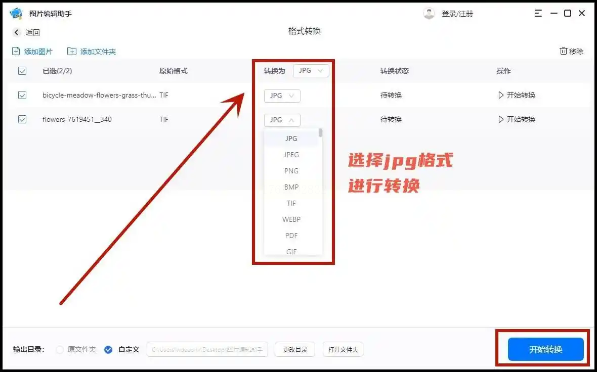 在图片转换的独立界面中,添加你的TIF图片。添加后,注意检查界面上的输出格式是否默认为或已设置为“JPG”。