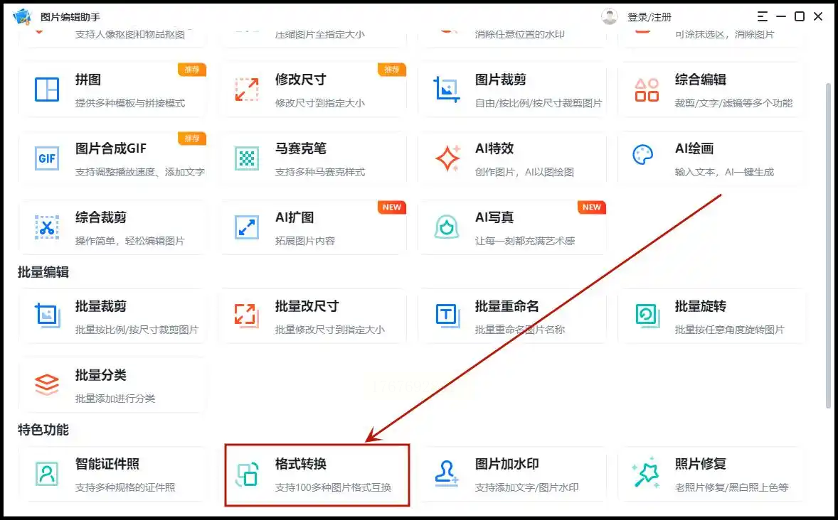 在电脑上安装并打开软件,在主界面琳琅满目的功能图标中,找到并点击【图片格式转换】。