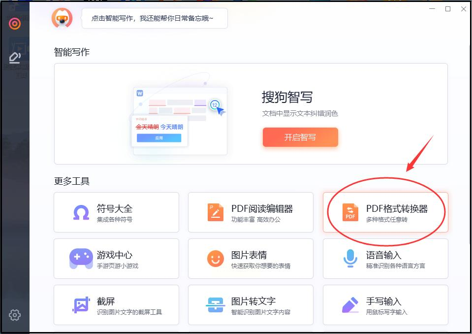 步骤一:确认电脑已安装搜狗输入法,右键点击任务栏输入法图标,选择“智能输入助手”。在弹出的功能面板中,找到“PDF格式转换器”并点击进入。