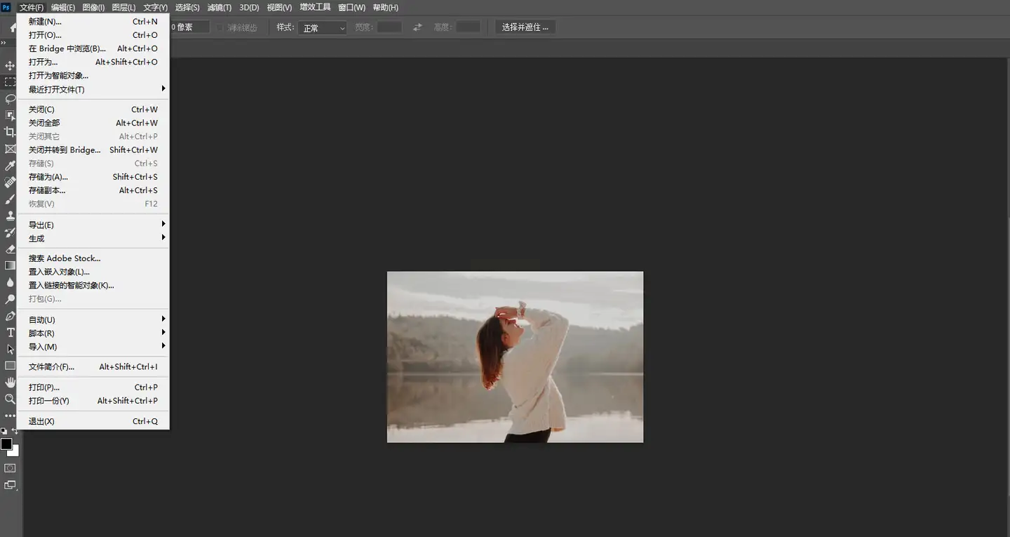 打开Photoshop后,点击界面左上角「文件」菜单,选择「打开」,在弹出的文件选择窗口中找到目标JPG图片,点击「打开」。此时图片将以普通图层形式加载到PS中。