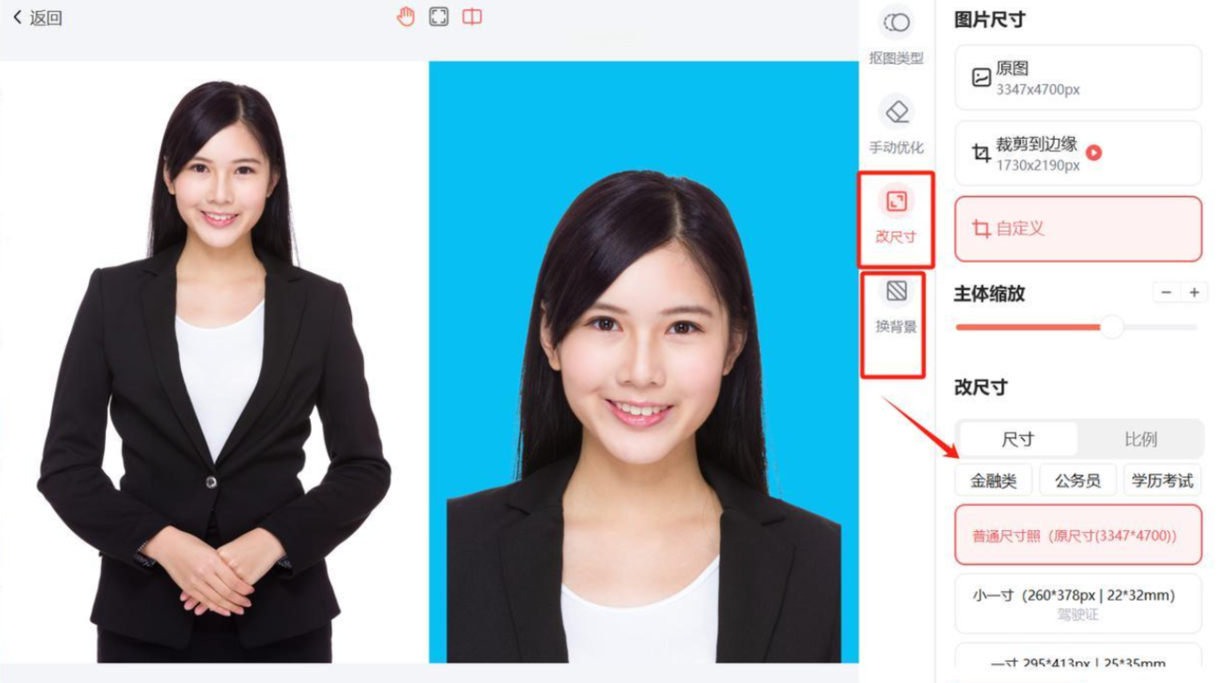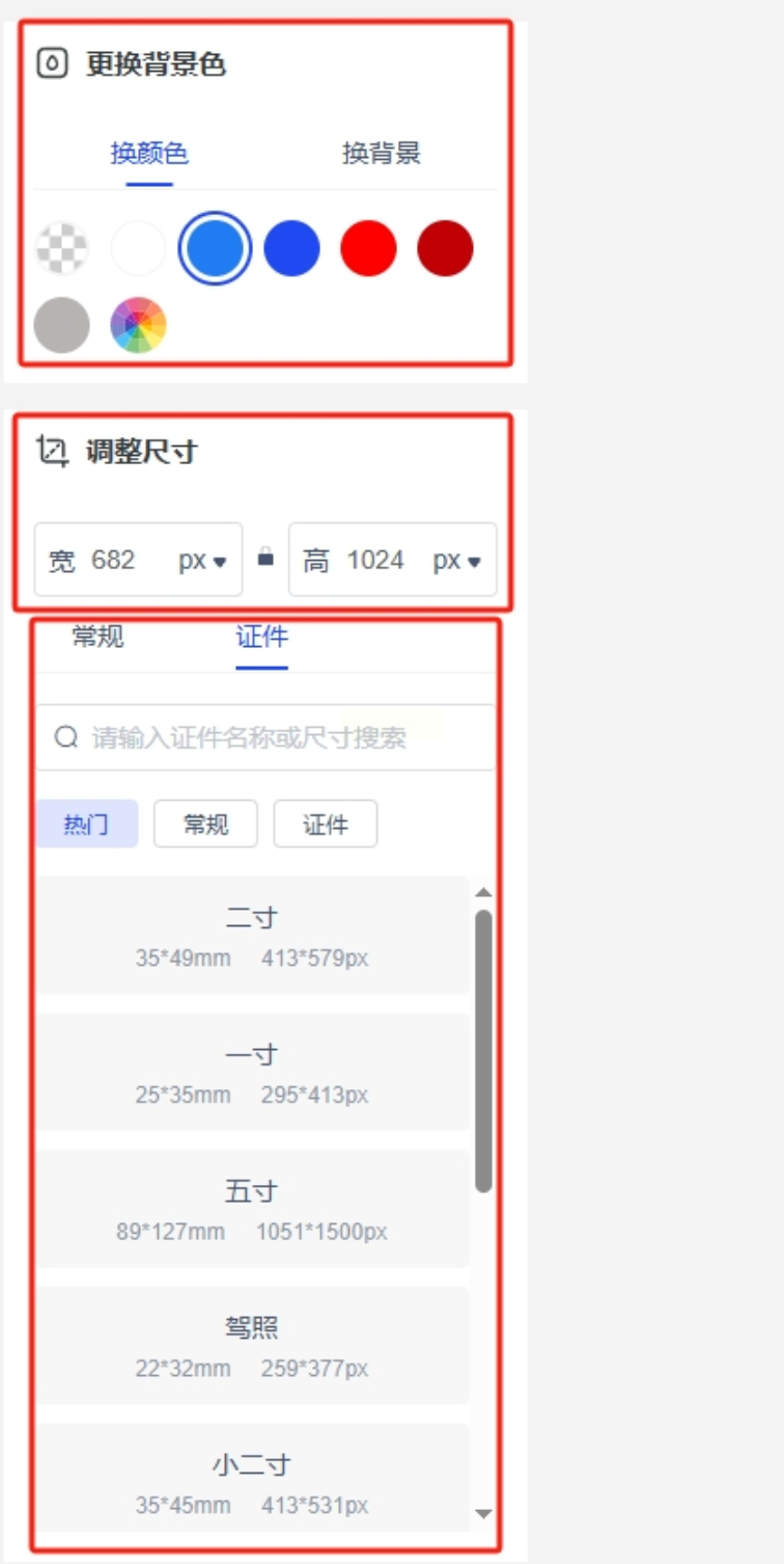 2. 尺寸自定义:在「尺寸设置」面板,可手动输入「宽高数值」(系统会自动提示对应分辨率),也能选择「智能匹配」模式,系统根据证件类型自动换算(如护照照片默认35×45mm)。