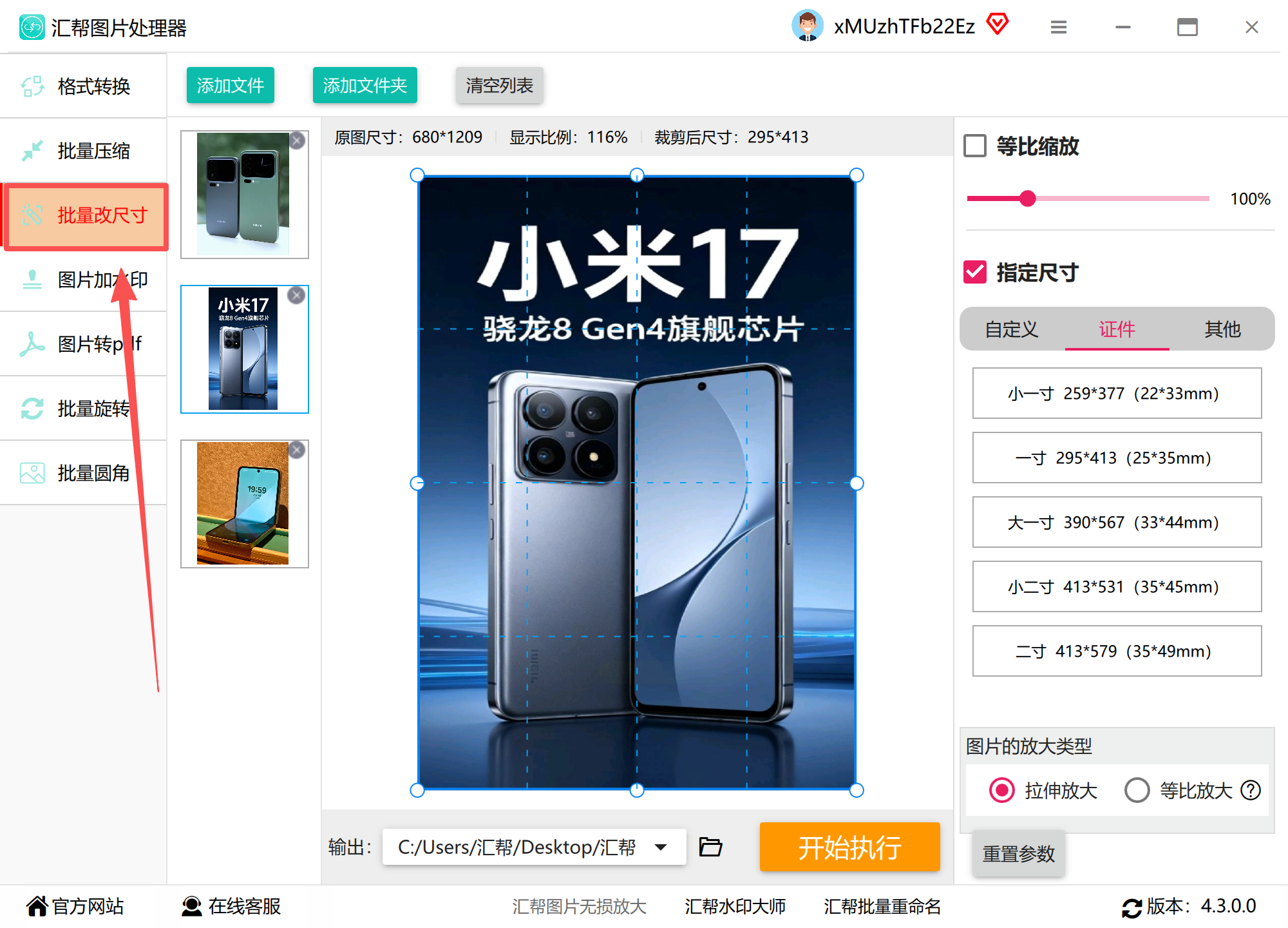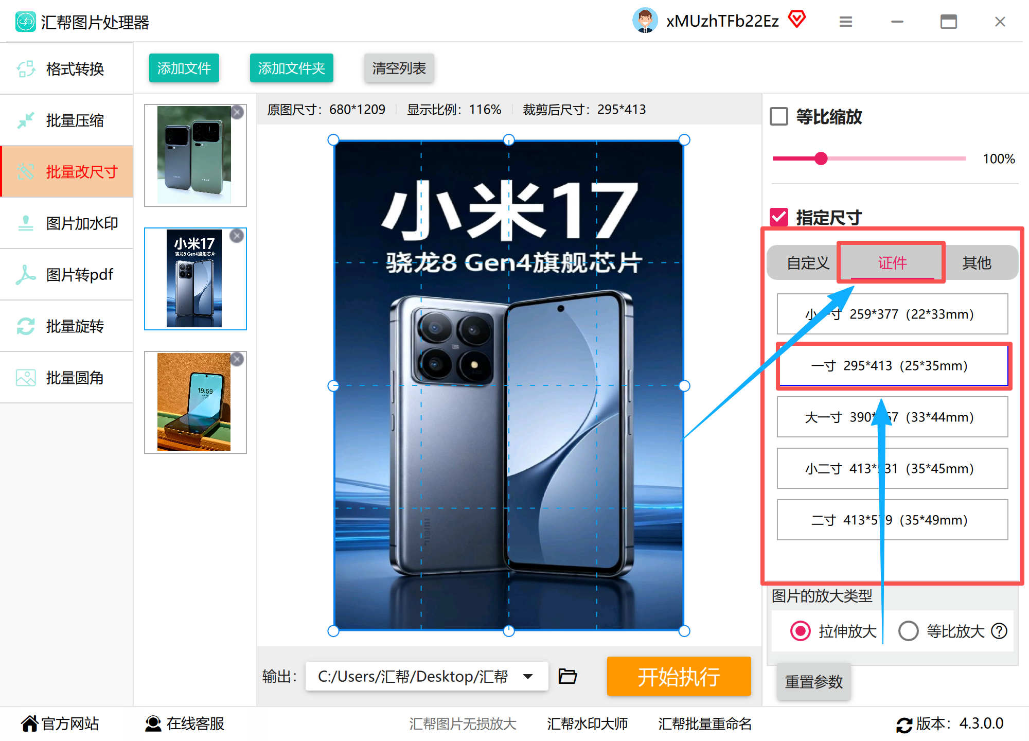 3. 尺寸设置:在右侧参数面板勾选「精准尺寸」,选择「一寸证件照」选项(系统内置20+常用证件模板),此时宽度自动锁定295像素(分辨率300dpi)、高度413像素,背景色默认白色可直接修改。