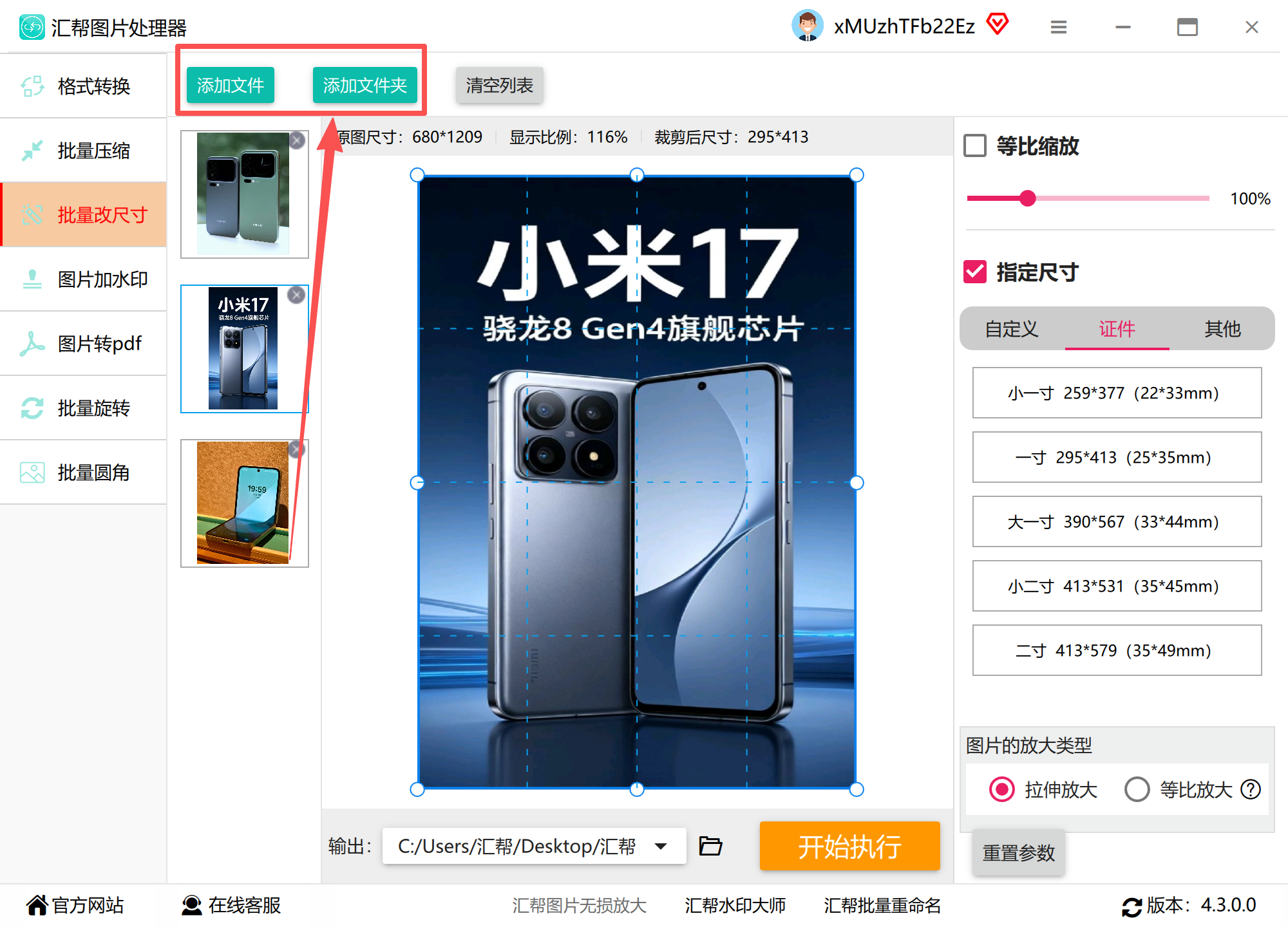 2. 文件导入:点击「添加文件」按钮,可批量导入100张以内的图片,也支持直接拖拽文件夹到操作区,系统会自动识别格式兼容情况。