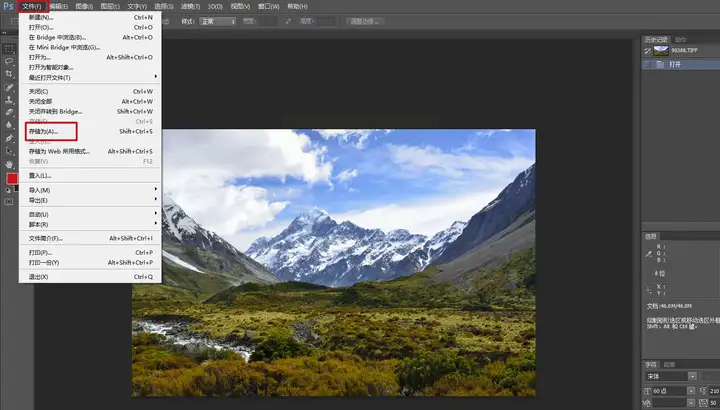 步骤一:启动Photoshop,然后通过“文件”菜单下的“打开”选项,导入你的TIFF图片。