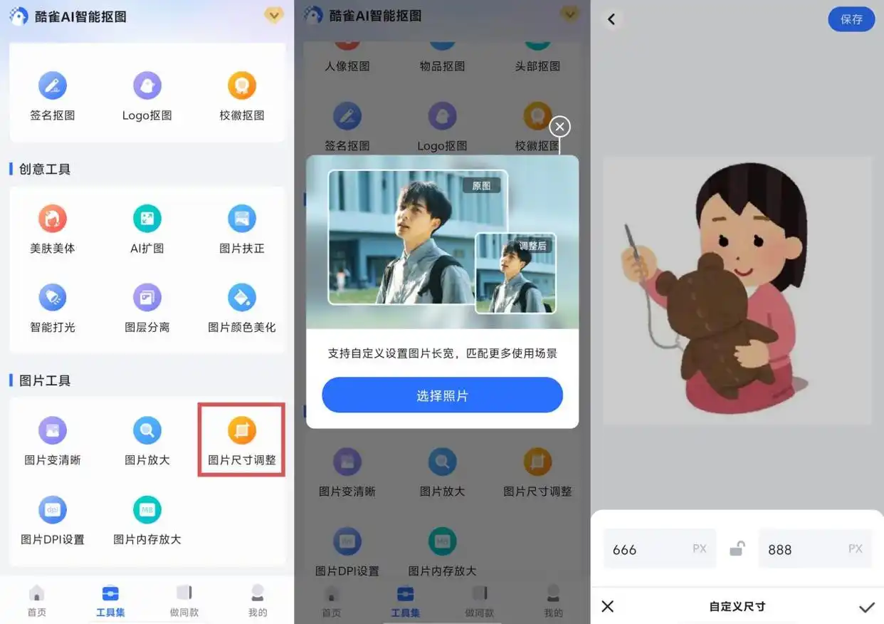 访问酷雀AI智能抠图官网,上传图片后软件会自动识别主体进行抠图,你也可以手动微调细节。完成后可直接在软件内调整尺寸,但更适合需要先抠图再改尺寸的场景,处理速度稍慢。