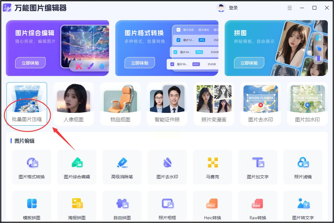 步骤1:下载并打开汇帮图片处理器,在左边栏找到"批量压缩",然后把要处理的图片拖进去(支持一次选几十张,超方便)。