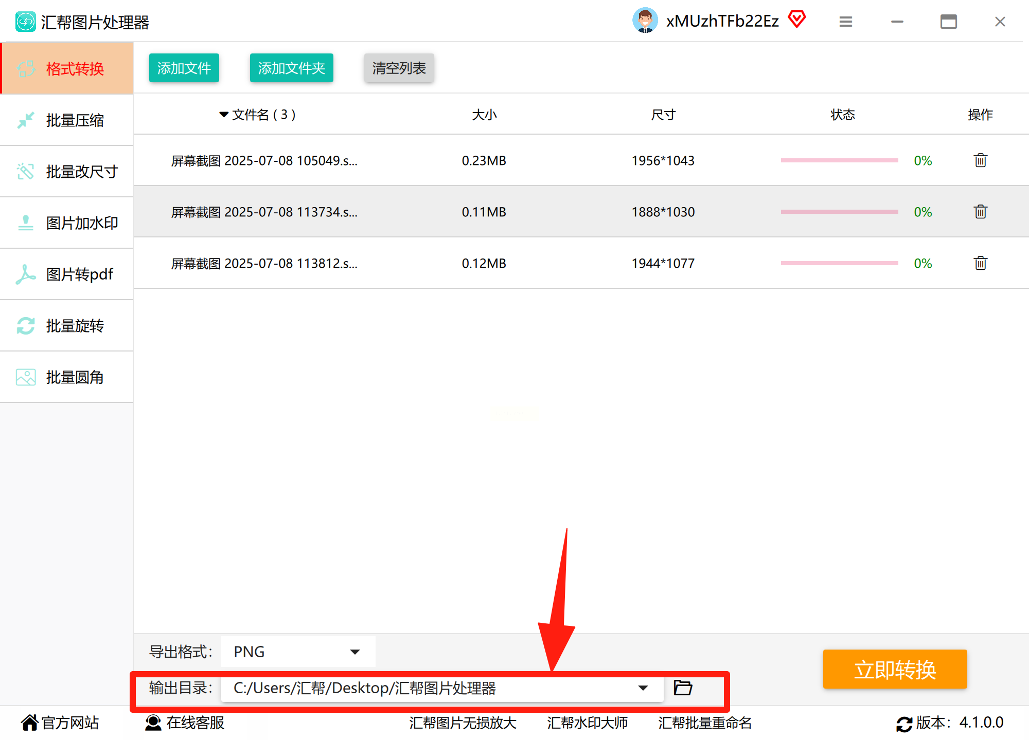 3. 设置输出格式:在下方格式选项里选「PNG」,如果需要压缩图片,记得把“压缩质量”调到80%(太高会占内存,太低又不清楚)。