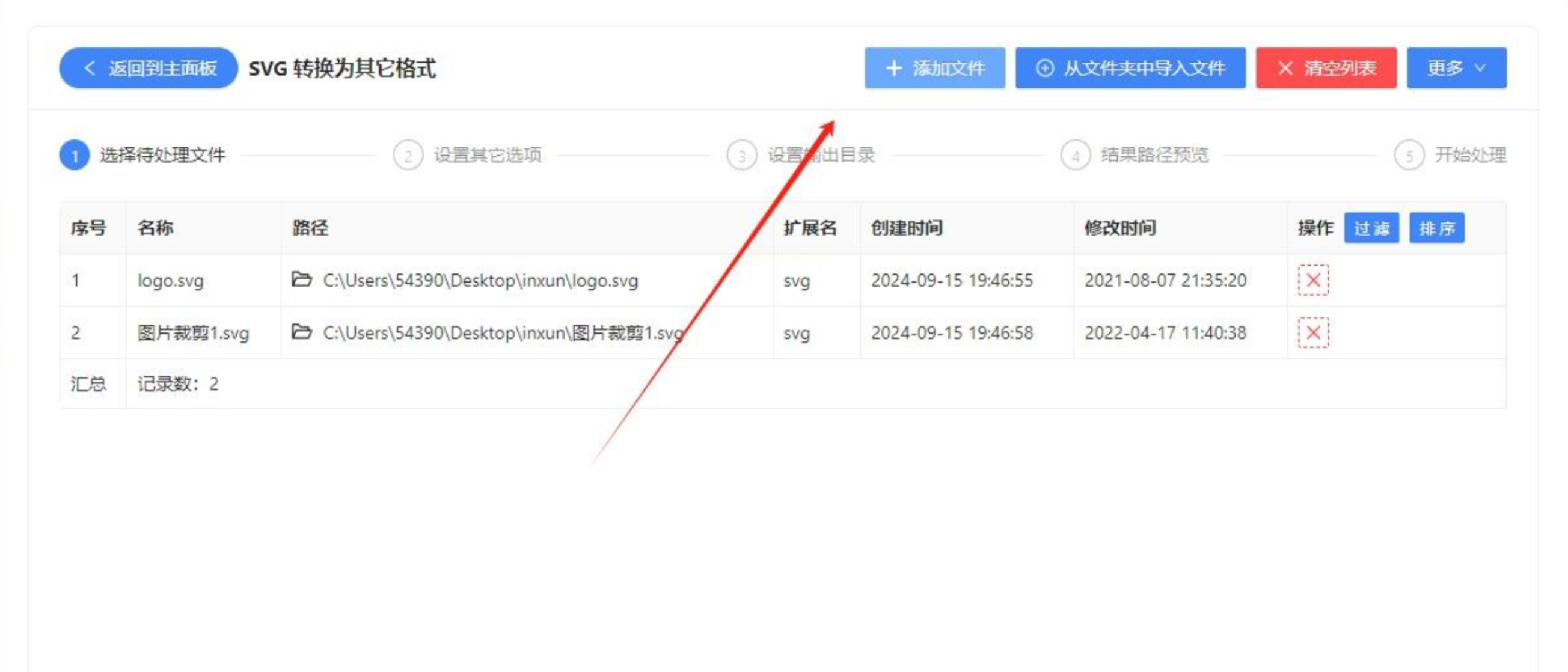 2. 批量导入文件:点击添加文件,支持多选多个SVG文件,也能直接拖放文件夹。