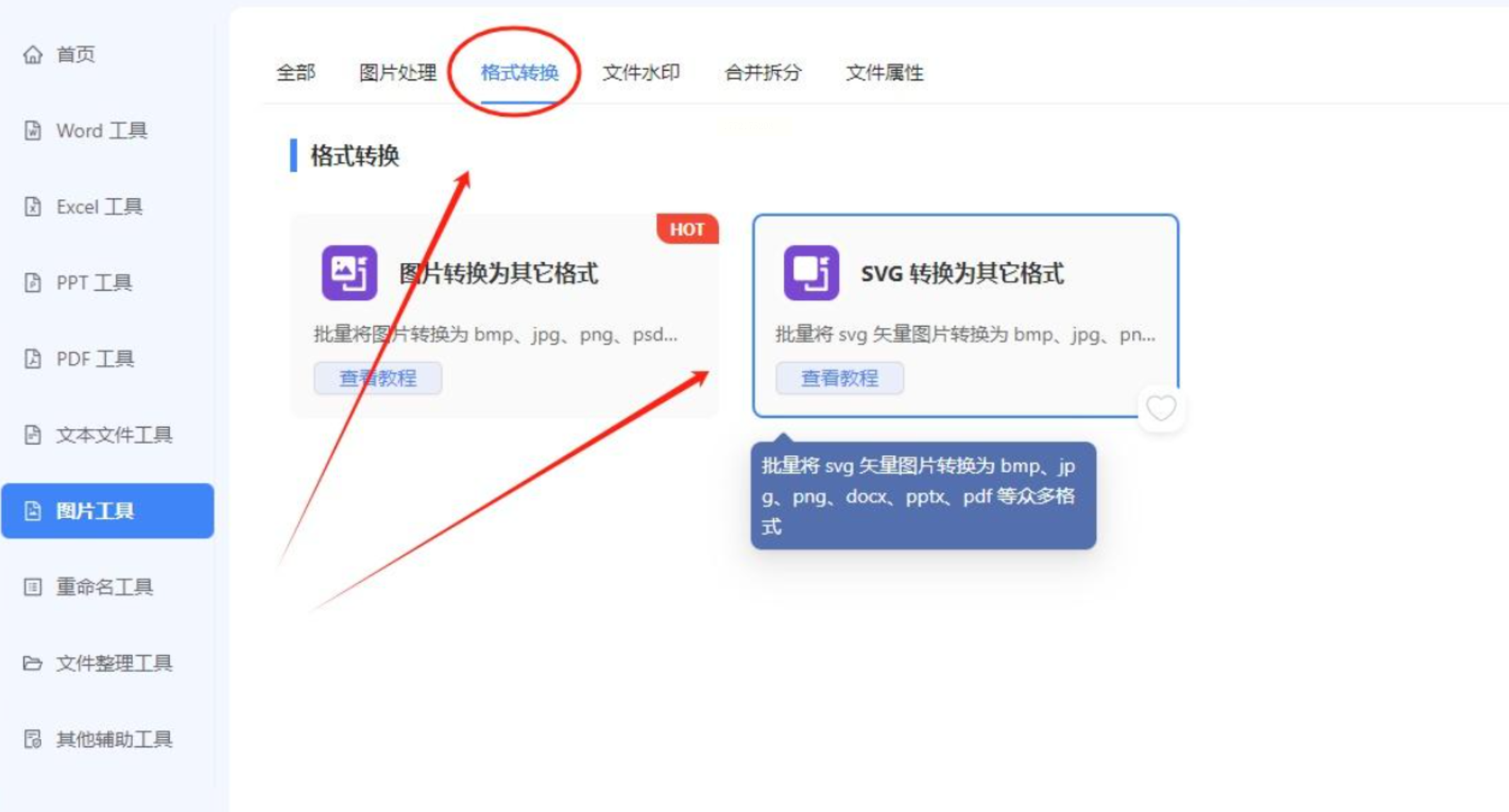 1. 选图片工具分类:打开软件后,左侧菜单找到"图片工具",右侧找到"SVG转换为其它格式"。