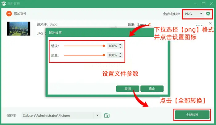 3. 设置PNG参数:在格式下拉框选"PNG",可自定义尺寸(比如默认2000×2000像素),直接点"全部转换"。