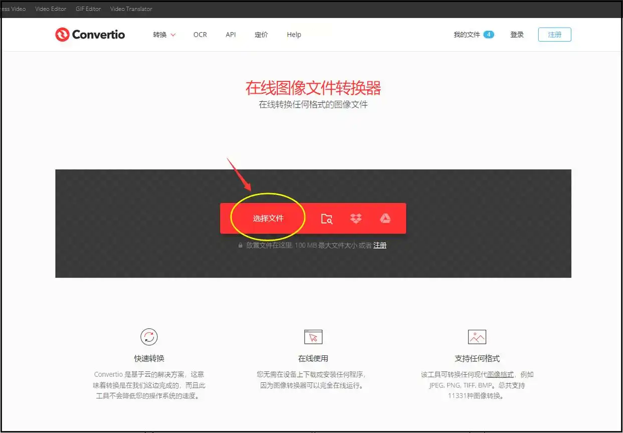 1. 打开网站选文件:在浏览器搜索"Convertio",进入官网后点击"选择文件",直接上传SVG图片。