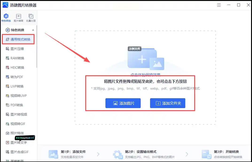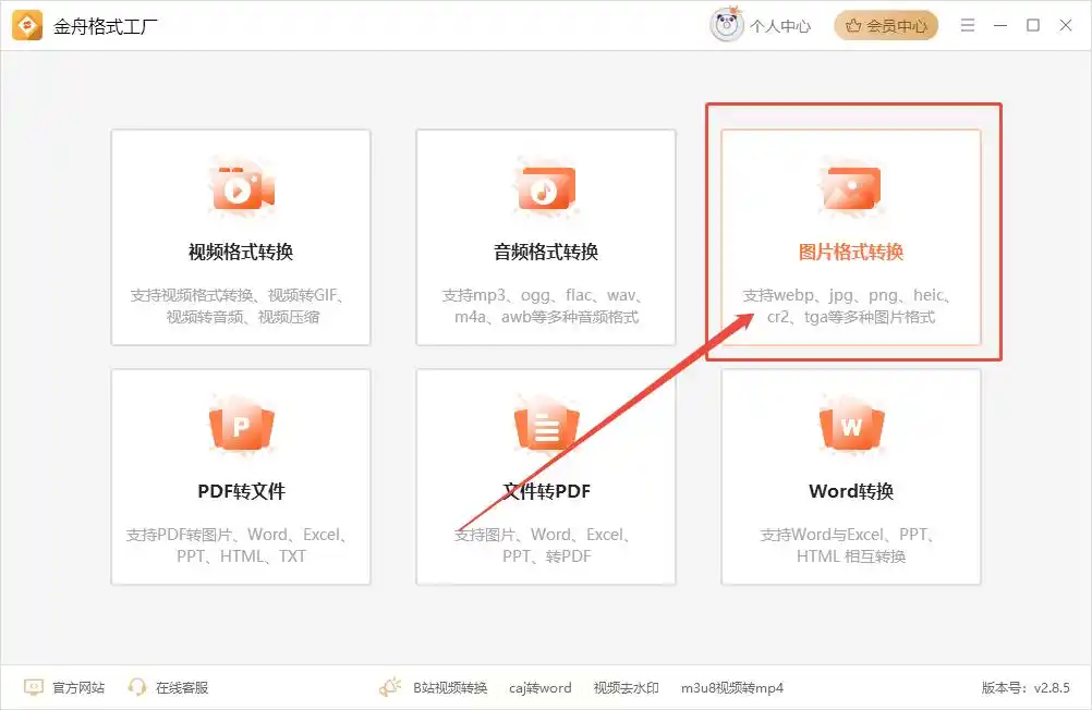 步骤一:在电脑上打开软件,在主功能面板上,你可以看到视频、音频、图片等各类转换选项。这里我们点击进入“图片格式转换”模块。