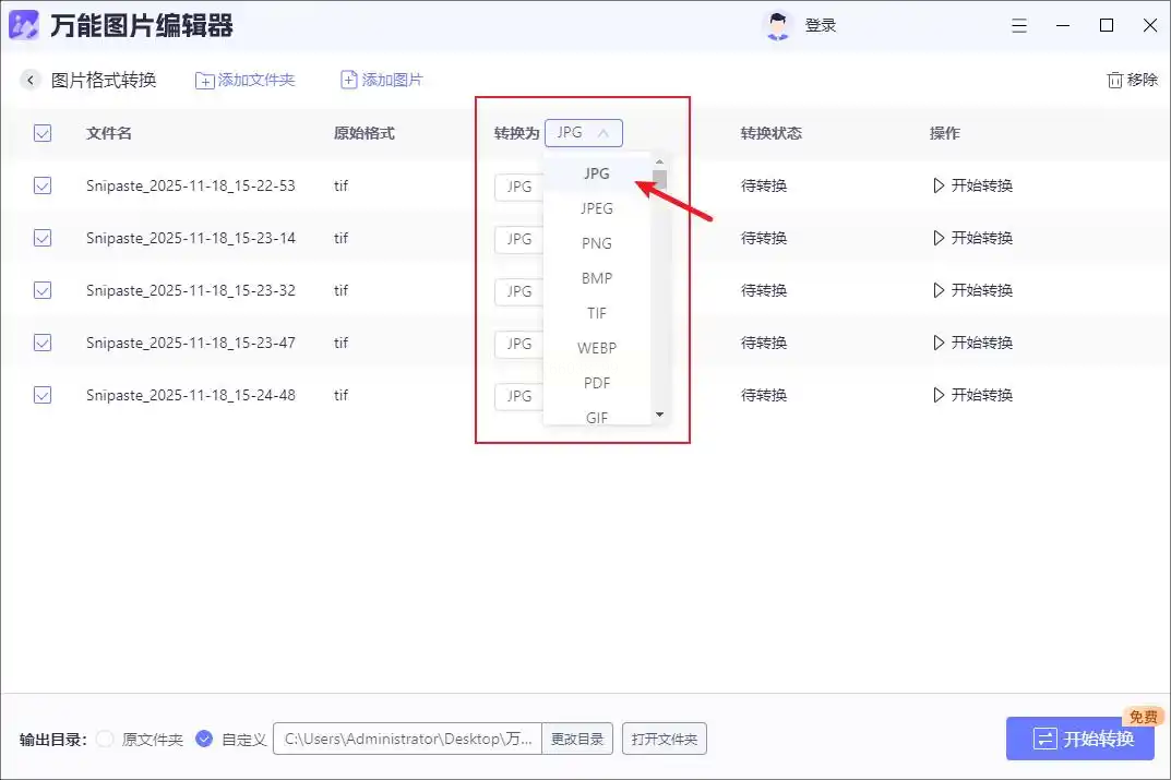 步骤三:在格式设置区选择“输出格式”为JPG,勾选“批量转换”选项可自动处理所有图片。