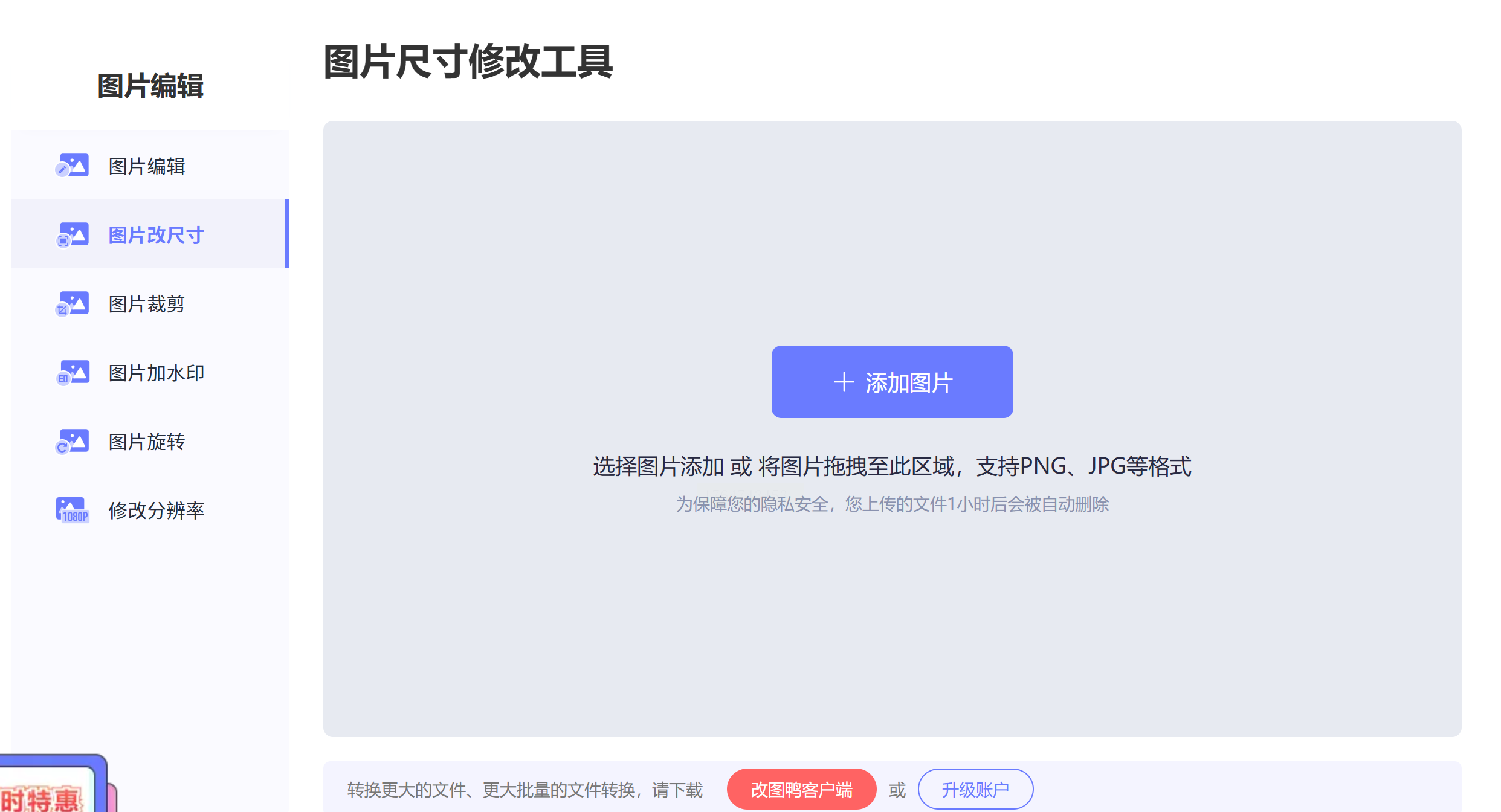 如果你不想安装软件,改图鸭是一个基于网页端的在线工具,适合临时处理少量图片或电脑配置较低的用户。