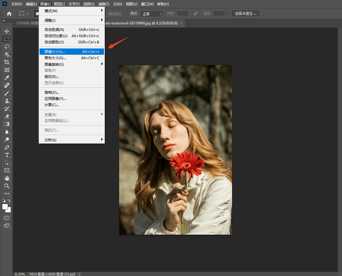 2. 点击顶部菜单栏“图像”→“图像大小”,弹出设置窗口。