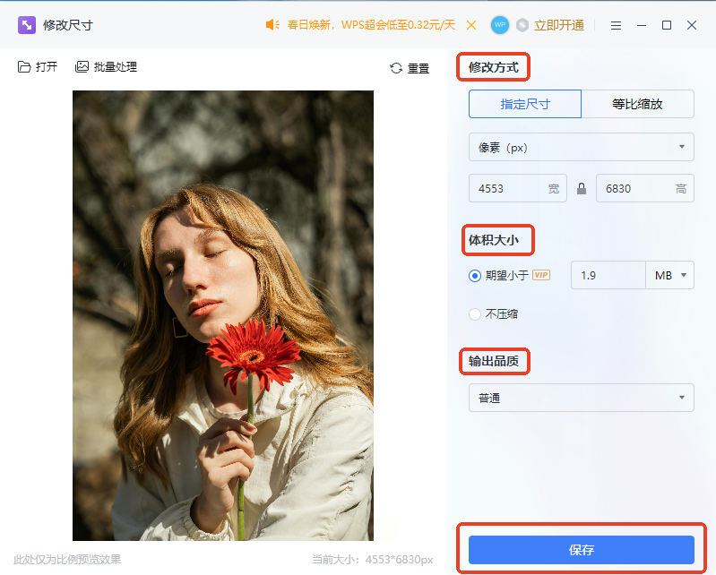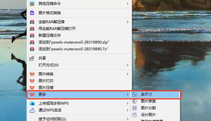 1. 用WPS打开图片 → 右键选【更多】→【改尺寸】;