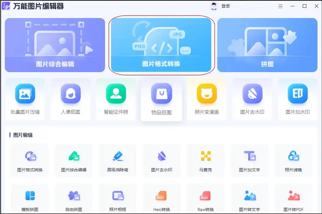 启动万能图片编辑器软件。在它的首页或主菜单里,寻找“格式转换”、“文件转换”或类似的功能入口。点击进入这个功能模块。