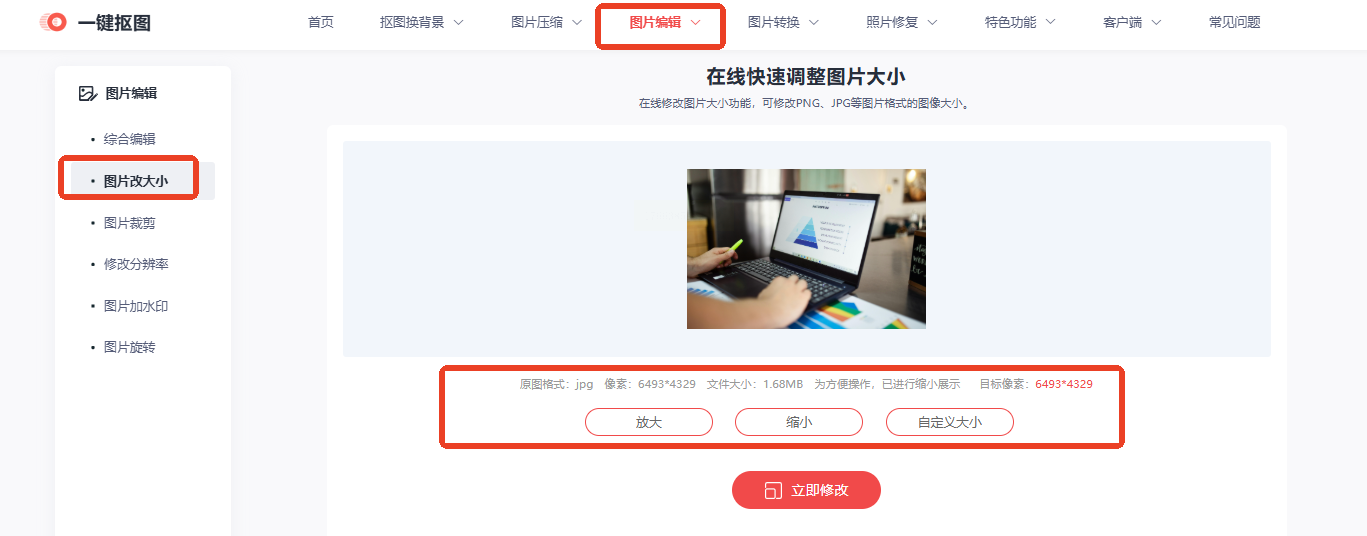 步骤一:在浏览器中访问该在线平台。在网站主页的功能导航区域,找到如图片编辑、图片工具之类的分类,在其中定位并点击“图片改大小”或类似名称的功能入口。