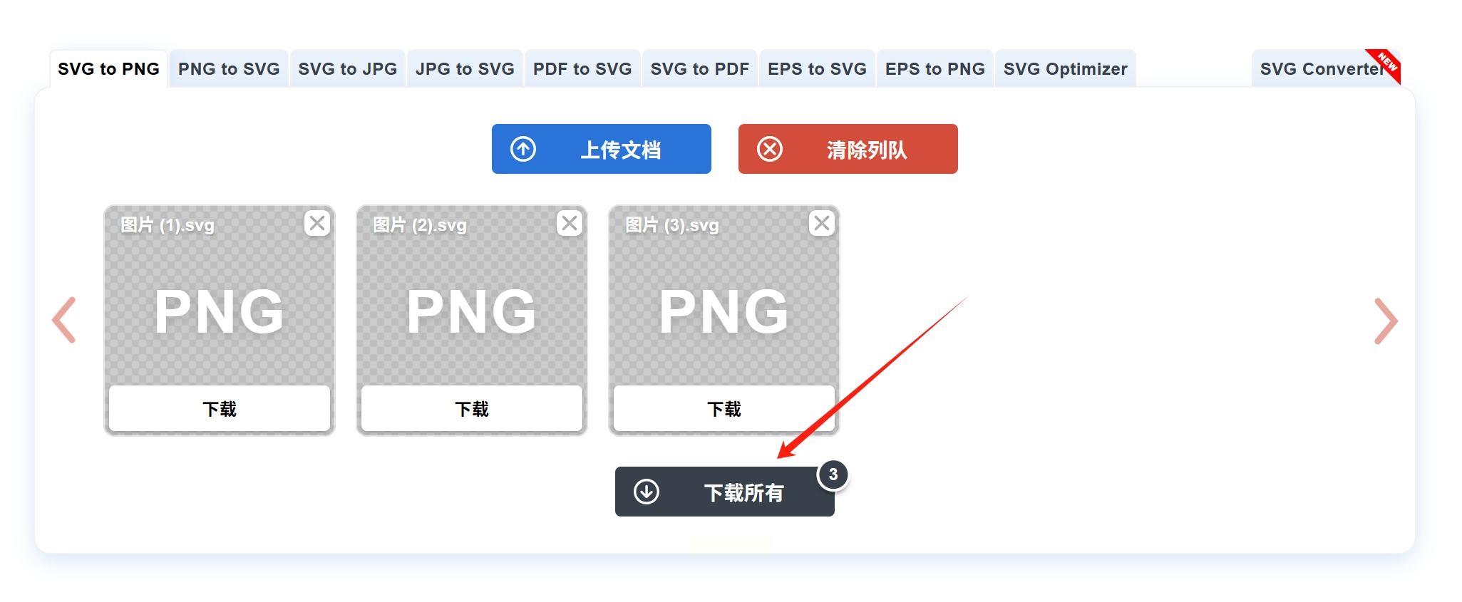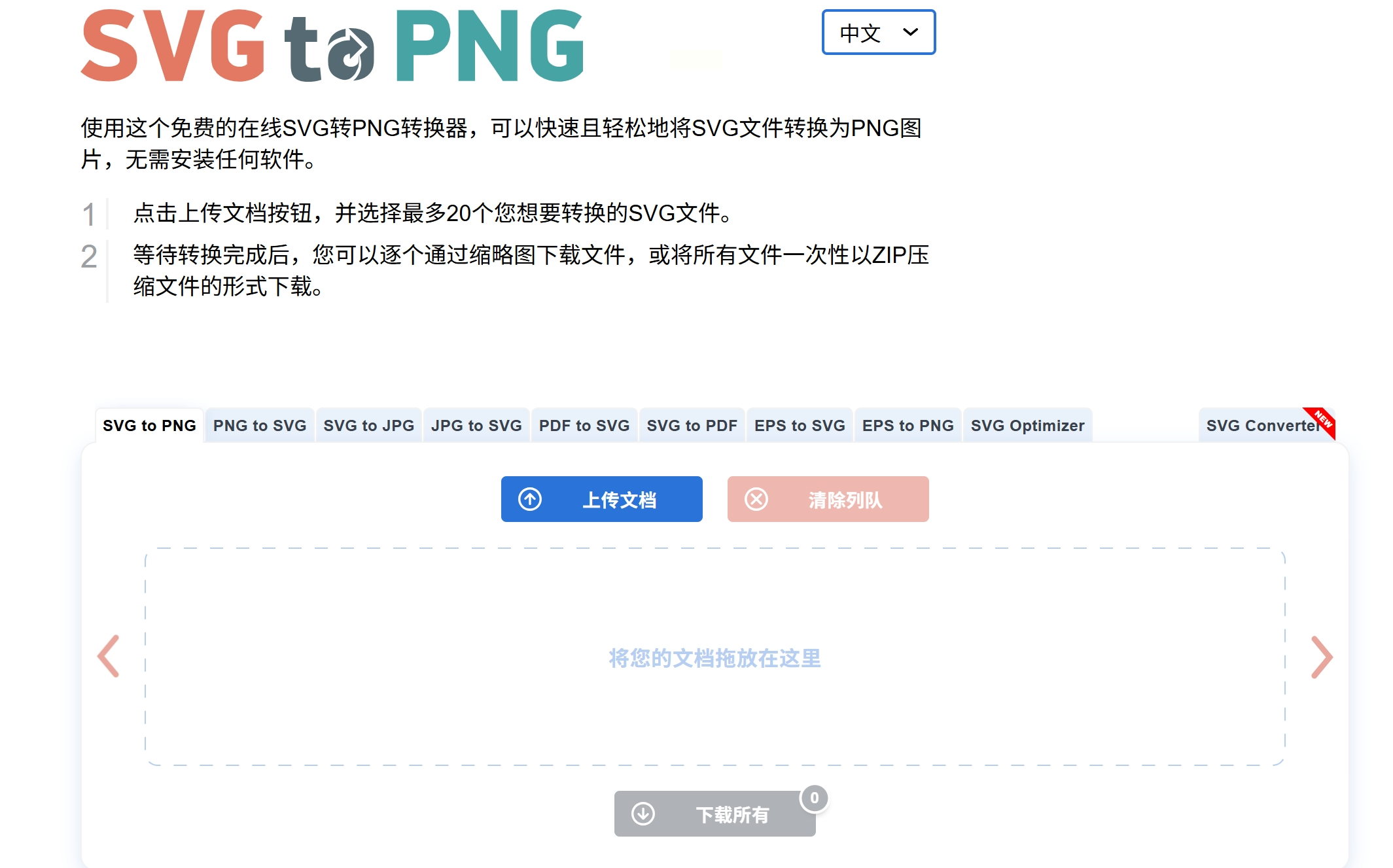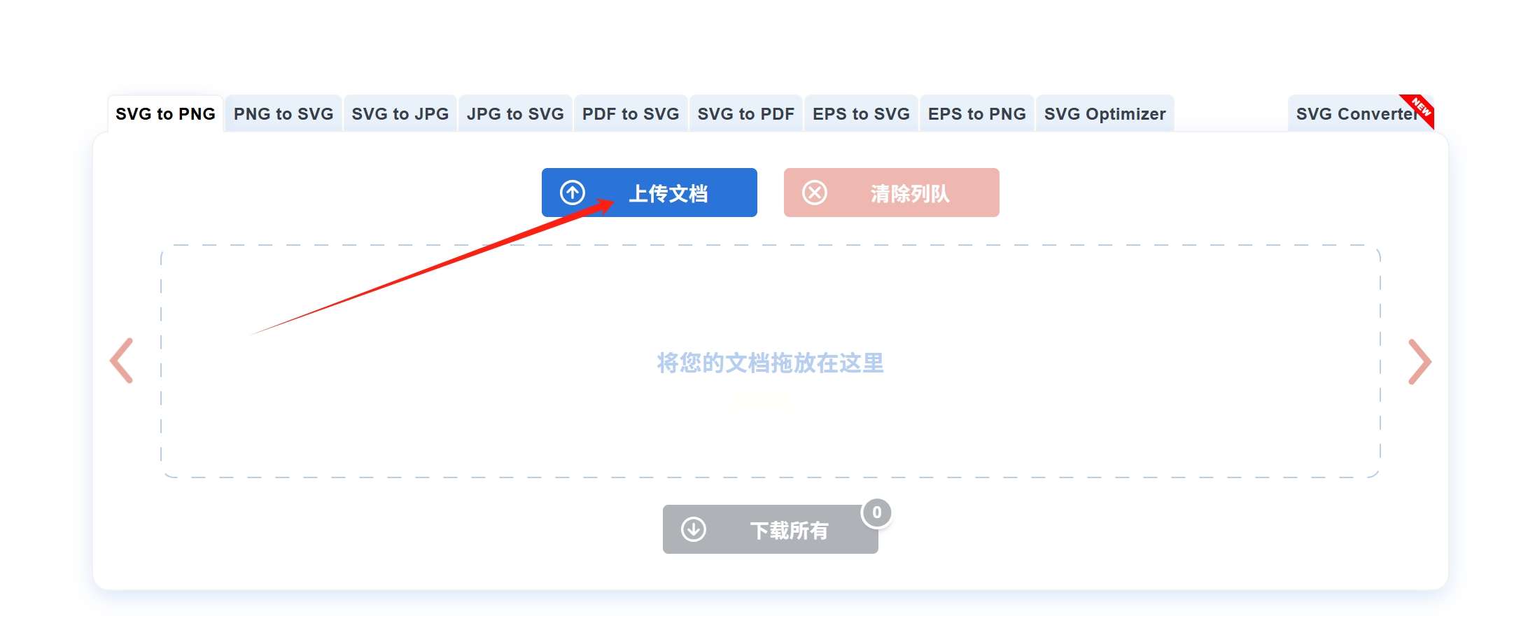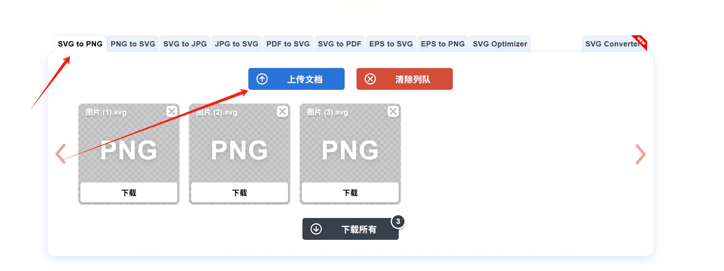 2. 点击页面上的"上传文件"按钮,选择需要转换的svg图片。一般来说,这些工具支持批量上传,但数量可能会有限制(比如最多20张)