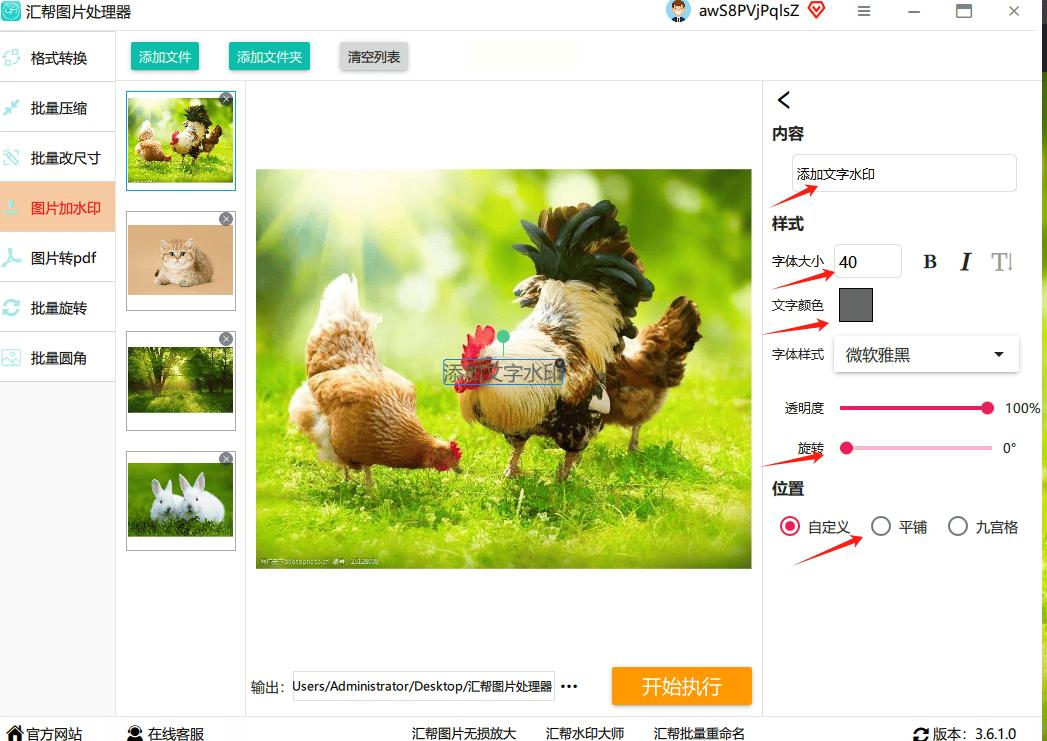 如果是文字水印,可以自定义内容、字体和字号;如果是图片水印,则可以上传自己的Logo等图像,并调整透明度、位置和旋转角度。设置完成后,点击“批量应用”,再点“开始处理”。