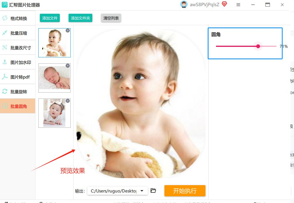 一定要记住这步!点【浏览】按钮,选个你容易找到的文件夹(比如新建个“圆角图片”文件夹放在桌面),这样处理完的图片不会混在原始文件里。最后点【开始执行】,软件会自动批量处理,进度条走完就大功告成啦!