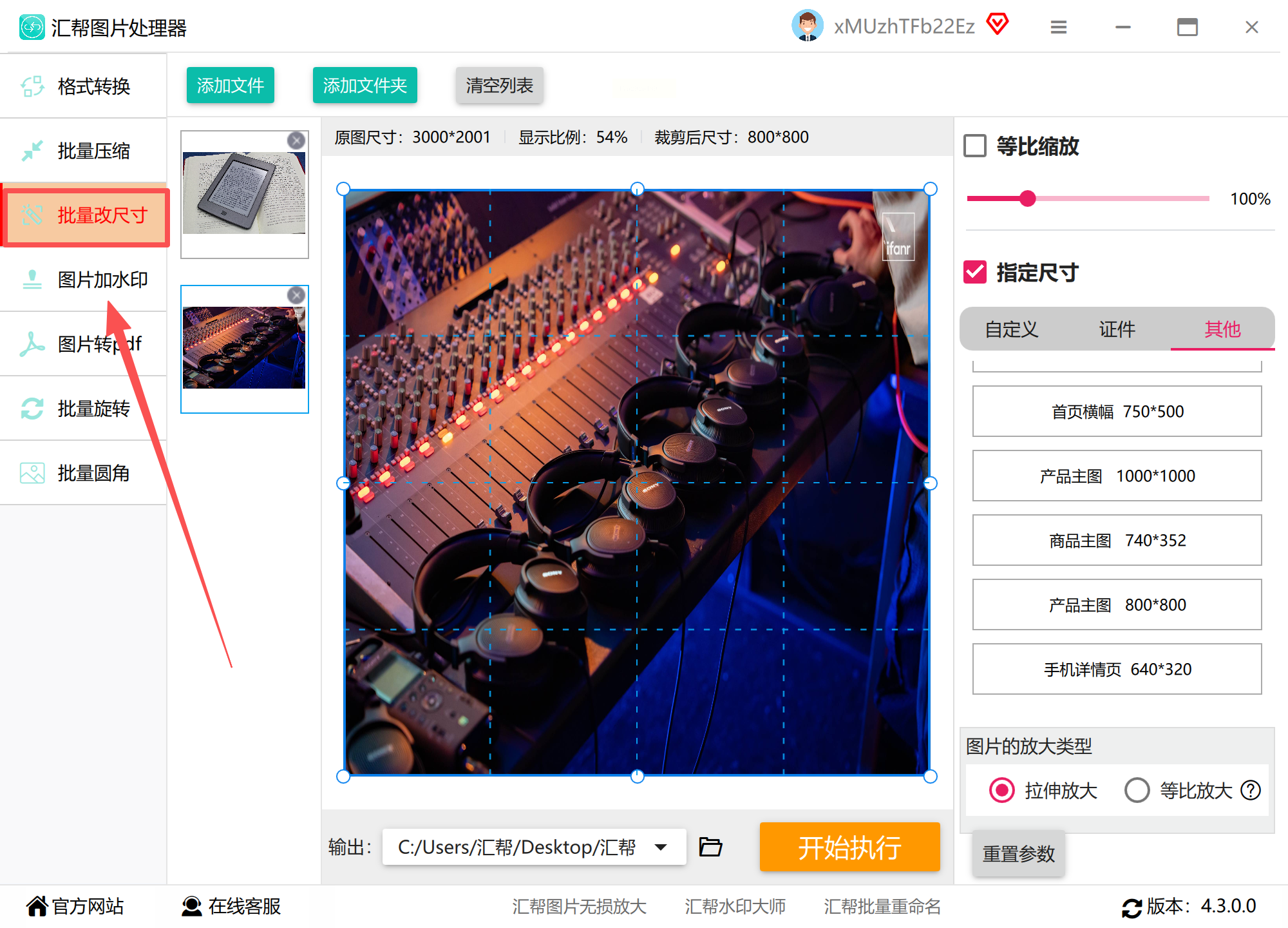1. 启动软件:打开汇帮图片处理器,在首页选择“批量处理”功能区的“尺寸调整”选项。