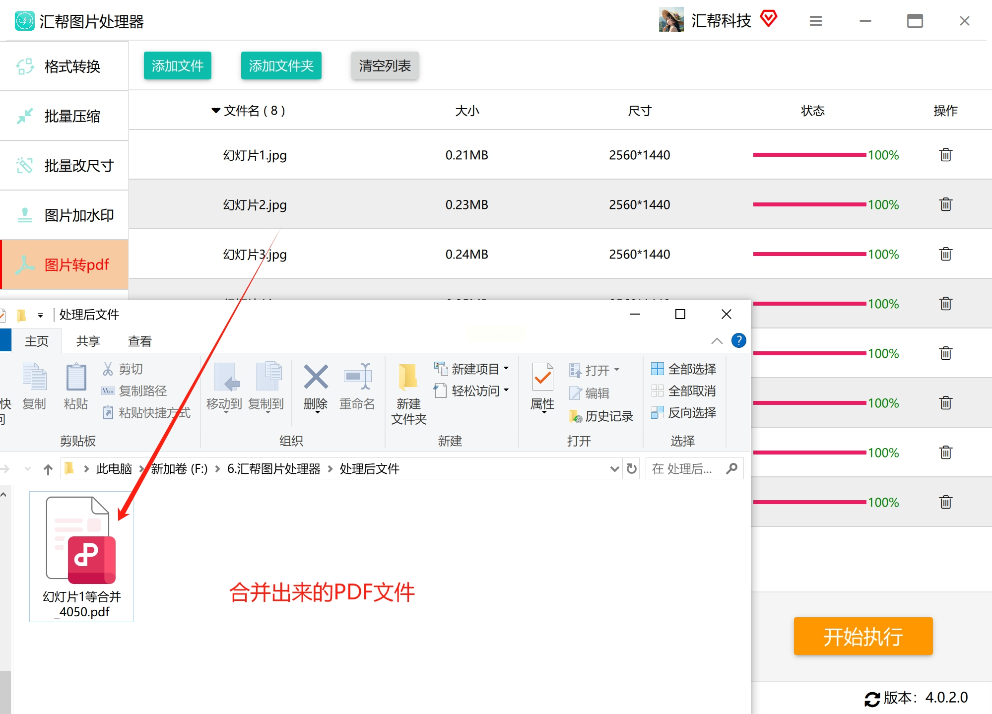 第四步:它完全在本地运行,点"开始执行",进度条走完就能直接打开PDF检查,图片顺序、清晰度一点没变,放进去的照片都能正常展示。