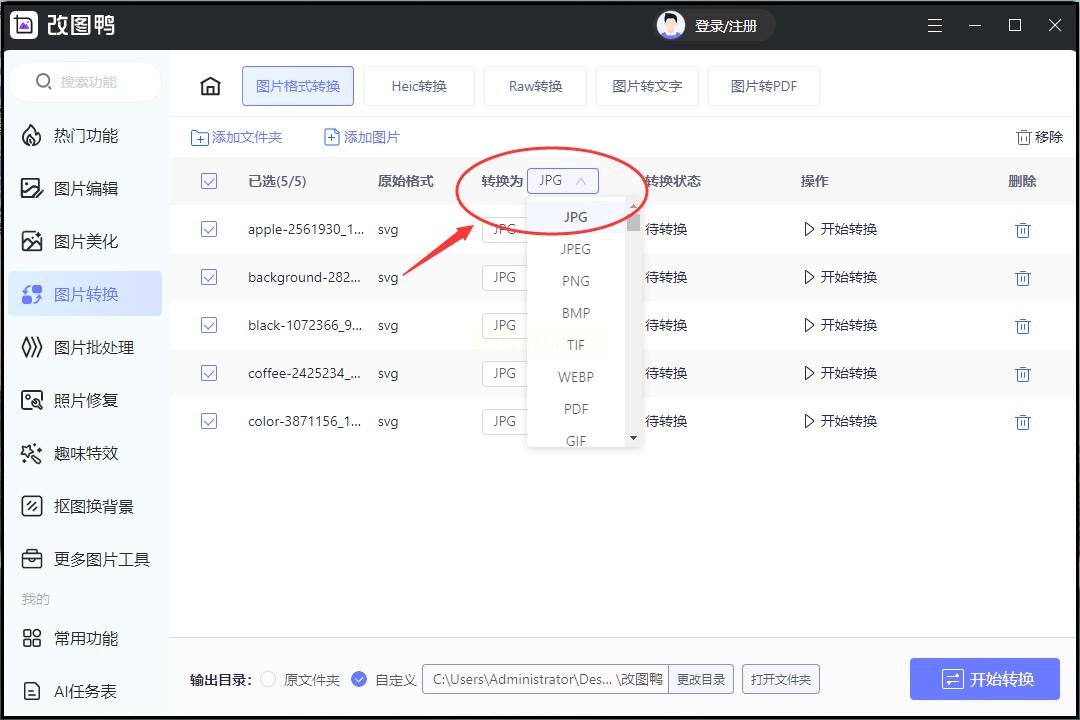 步骤二:设置输出为JPG格式,点“开始转换”,稍等片刻就完成了。
