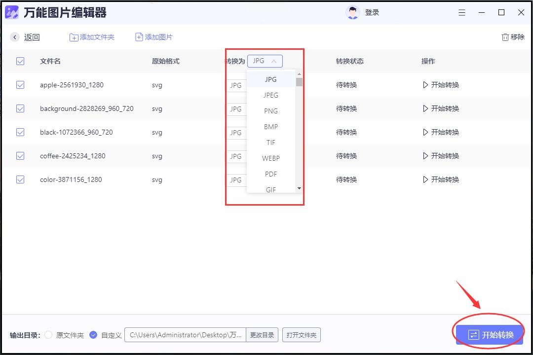 步骤二:选择JPG作为输出格式,点击“开始转换”按钮,软件会自动处理,生成JPG文件。