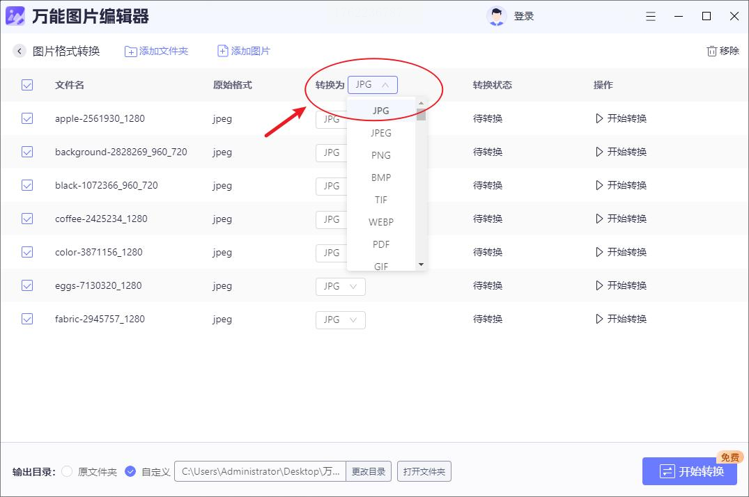 2. 在格式选项中选择“JPG”,点击“开始转换”即可完成。