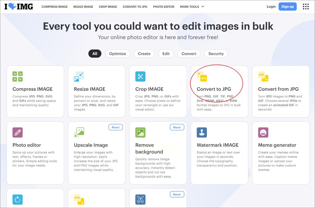 1. 访问iLoveIMG官网,选择“转换成JPG”工具。