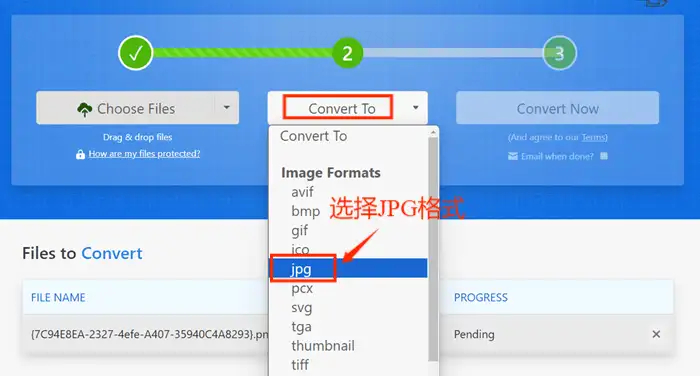 2. 选择“jpg”格式,点击“Convert Now”开始转换,完成后下载文件。