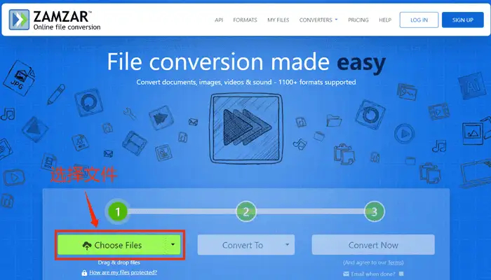 1. 搜索进入Zamzar网站,点击“选择文件”上传图片。