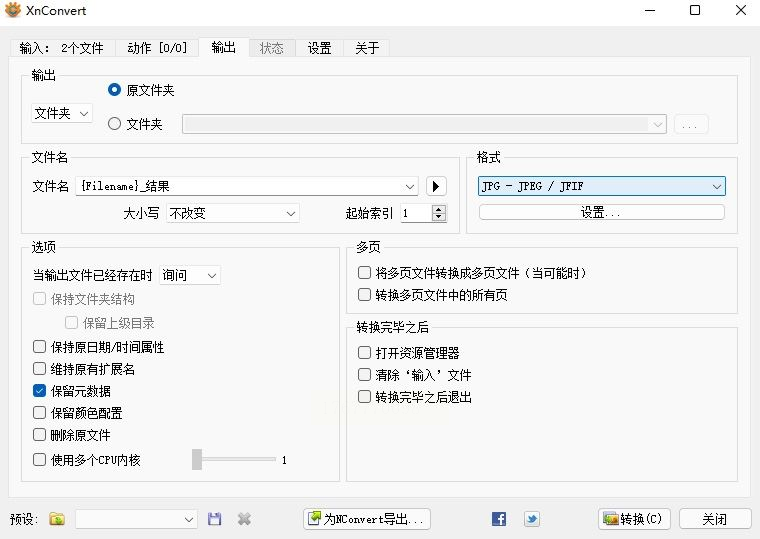 点击进入“输出”标签页。在“格式”一栏,选择“JPG”。你还可以设置输出文件的命名规则。最后,点击右下角的“转换”按钮,静静等待完成即可。