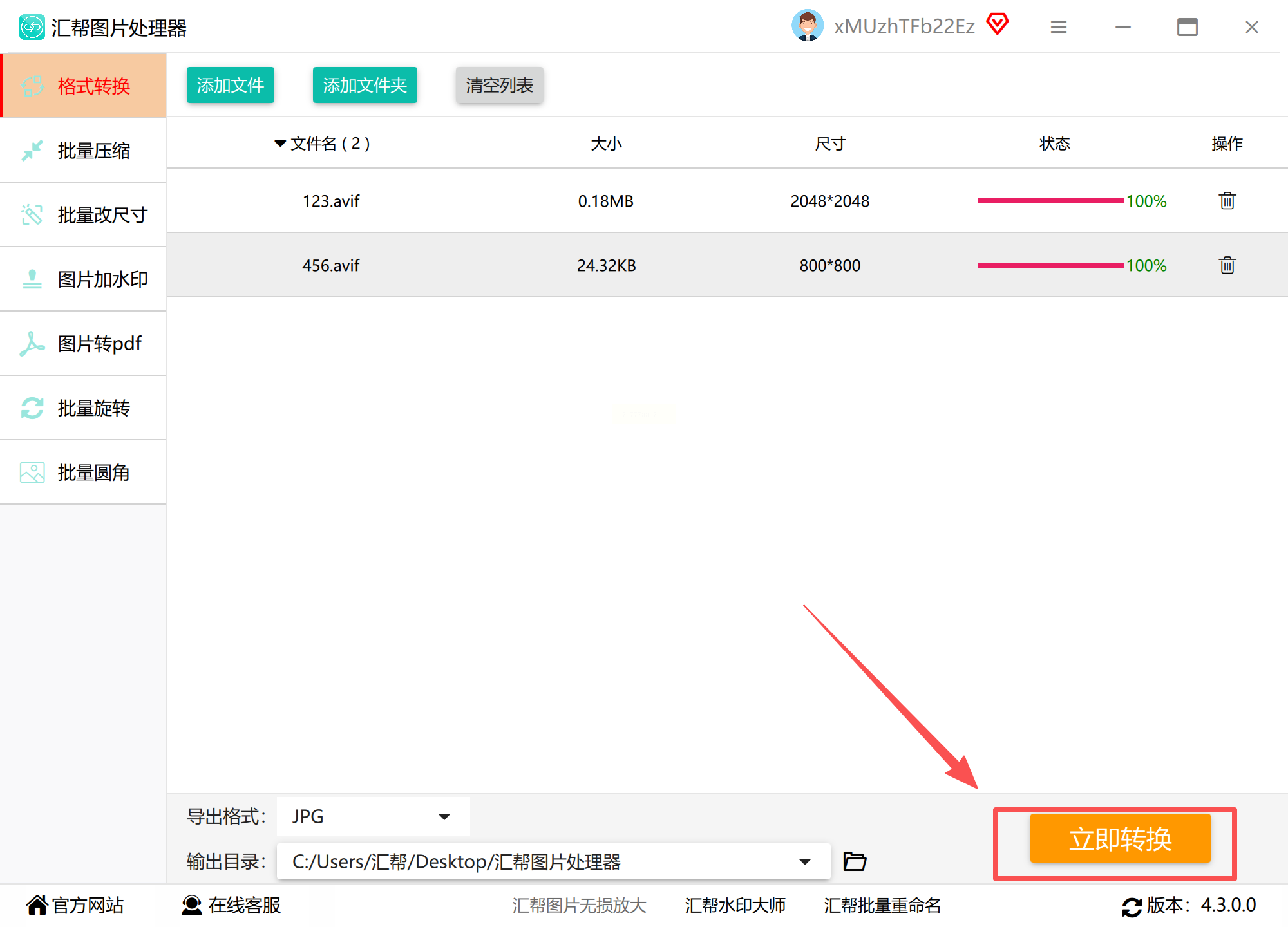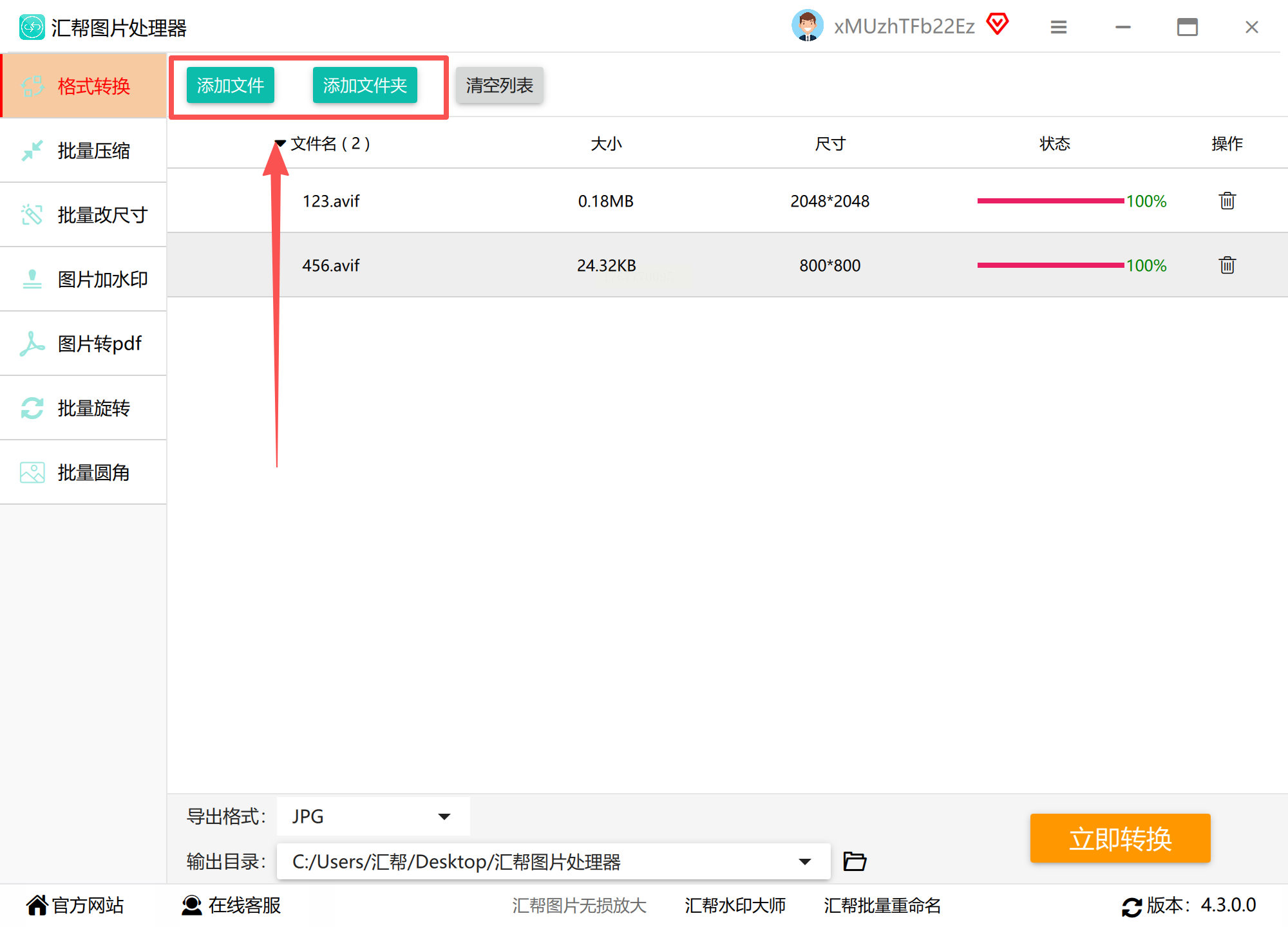 运行汇帮图片处理器,在主界面找到“添加文件”或“导入”按钮。你可以逐个选择文件,也可以一次性选中多个AVIF文件拖入软件,实现批量导入。