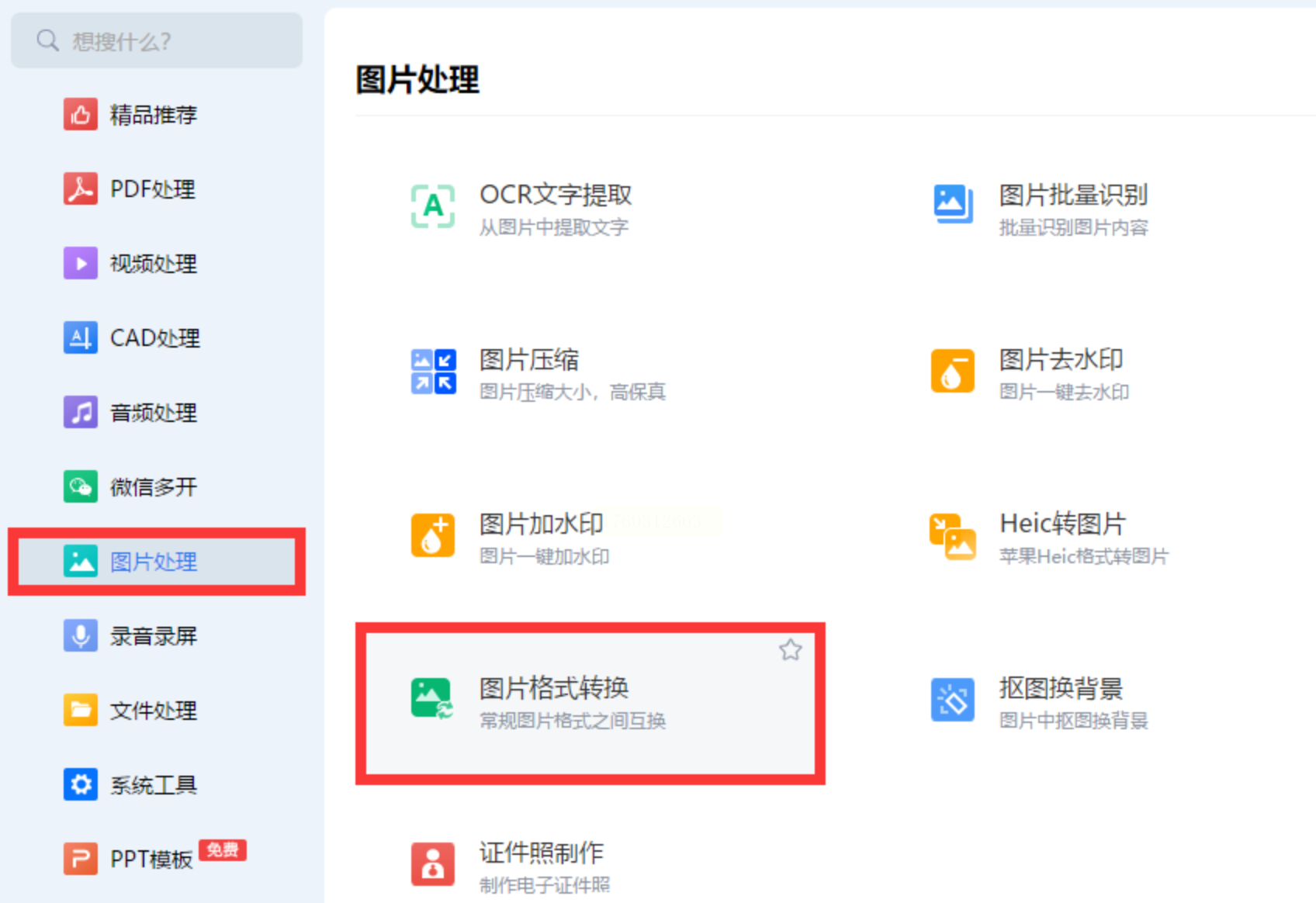 步骤一:打开彩虹办公中心软件,在左侧菜单栏选择“图片处理”模块,进入“图片格式转换”功能。