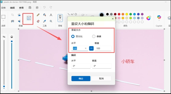 2. 在工具栏中找到“重新调整大小和倾斜”按钮,选择按百分比或像素方式调整尺寸,轻松把图片改成一样大小。