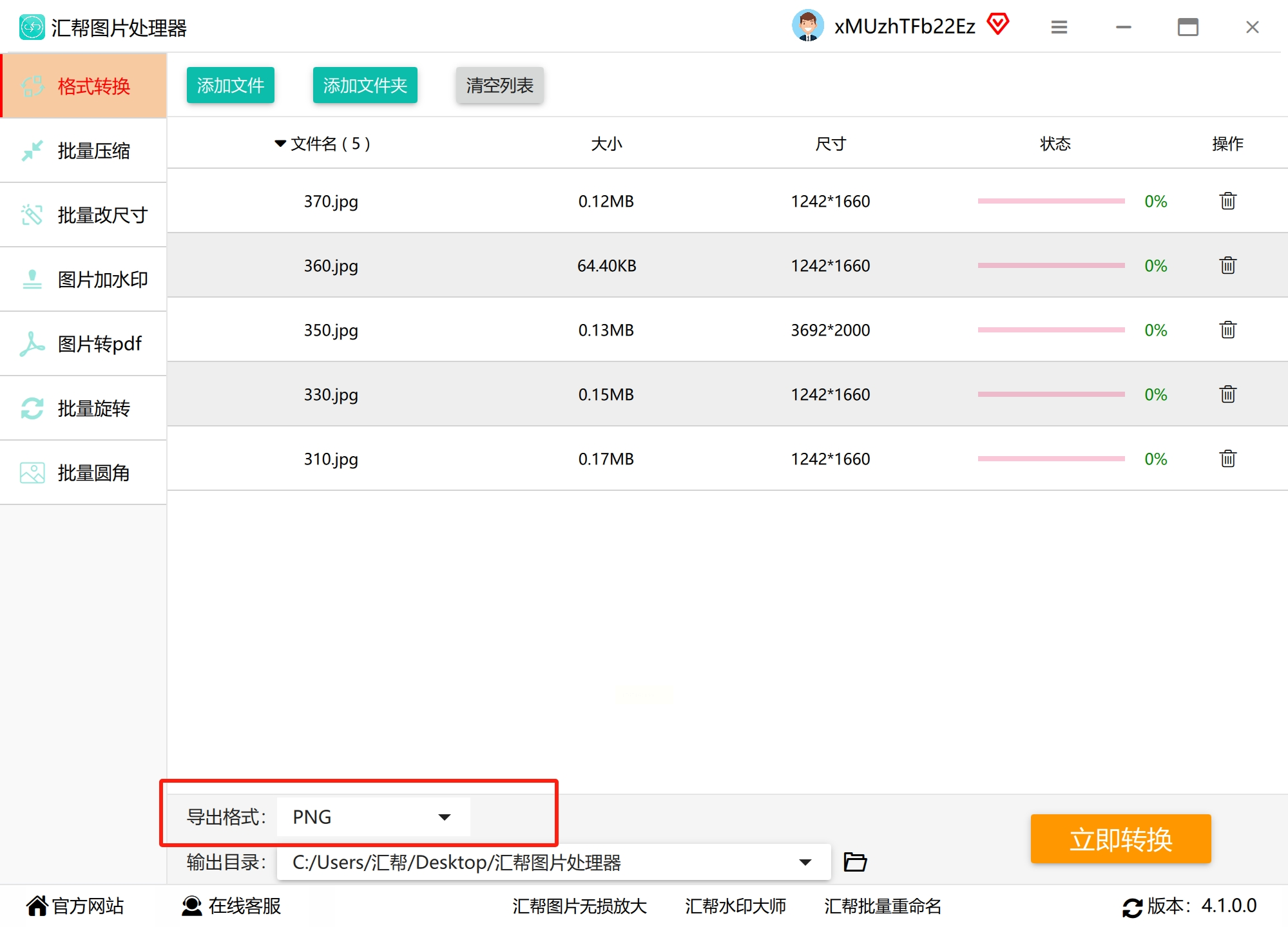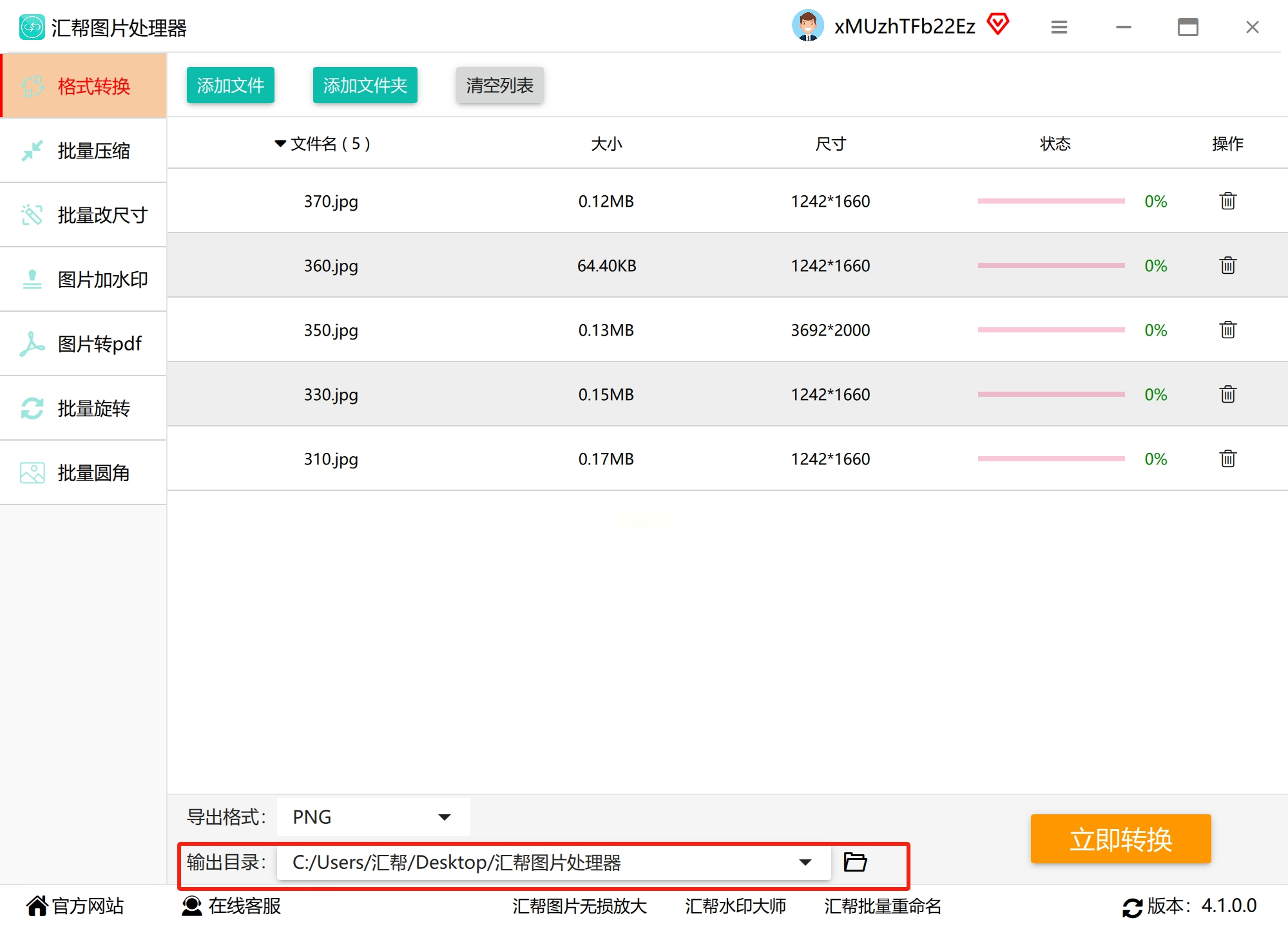 2. 选择输出格式:在右侧格式列表中选「PNG」,勾选「批量处理」可一次性转换多张。