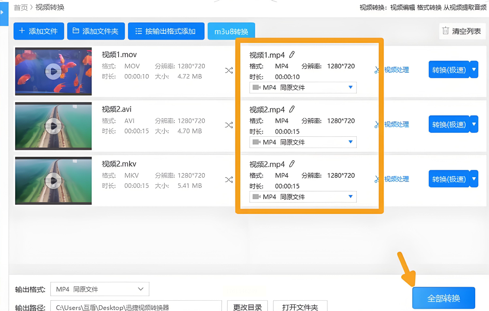 步骤四:确认设置后,点击“开始转换”并等待进度完成,文件将自动保存至指定目录。